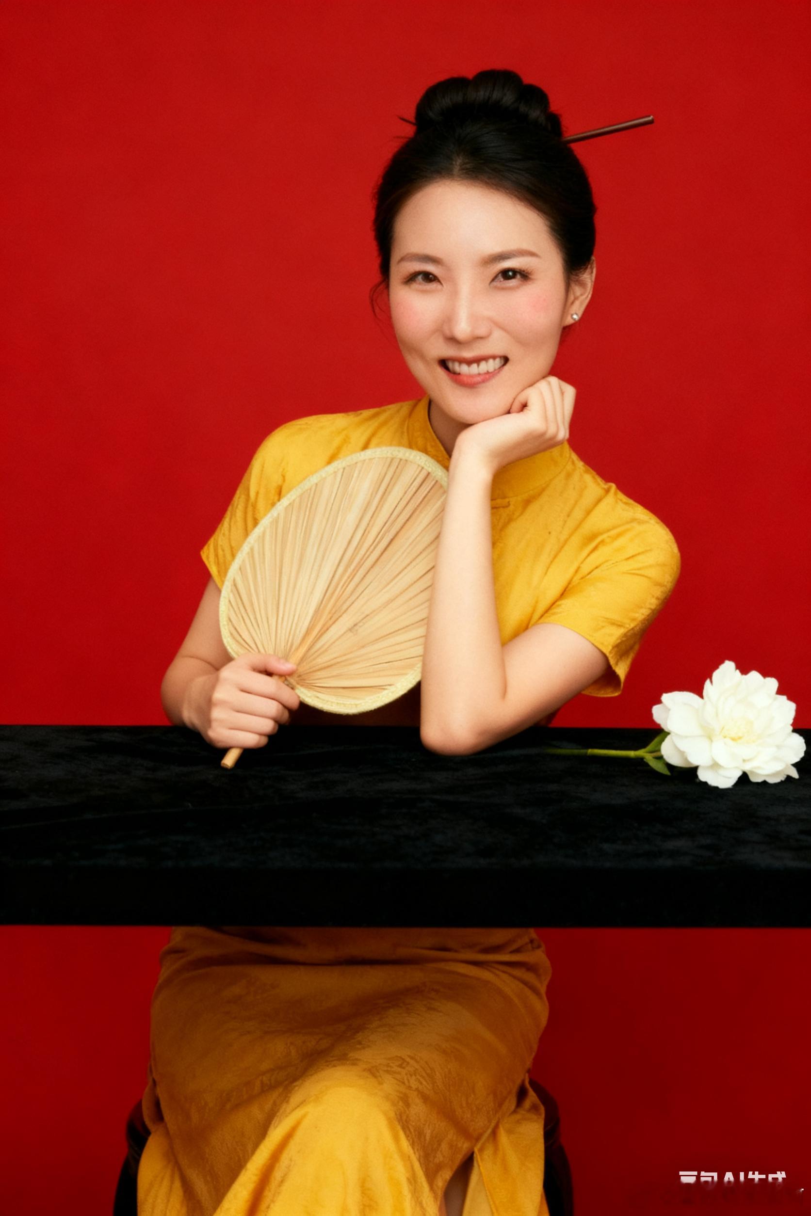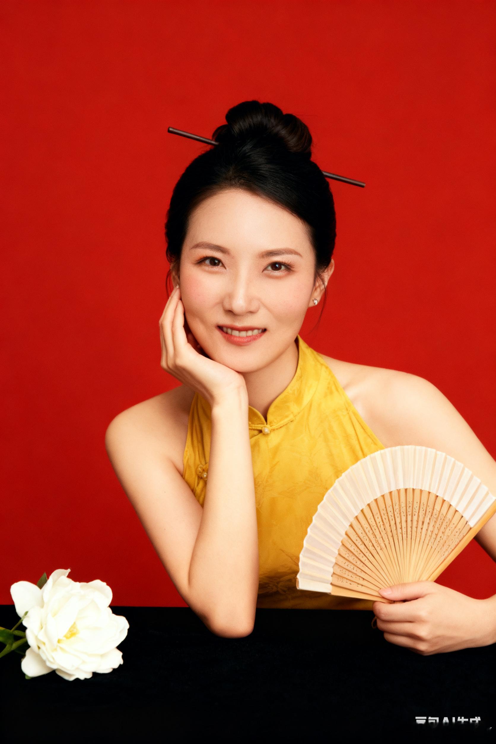 口令1:生成9张照片,人物表情、动作、取景和角度丰富,保持和脸部不变,盘发造型戴一根发簪,正面看镜头,手撑桌子托腮,桌子是黑色的,桌上放着一支白色的花,穿着黄色的旗袍拿着一把折扇,头身比例正常和谐,皮肤通透,脸上有一点点腮红,模拟富士相机胶片滤镜,背景是红色纯色背景,国风风格,人物居中占比三分之一,尽量真实生动。比例2:3。