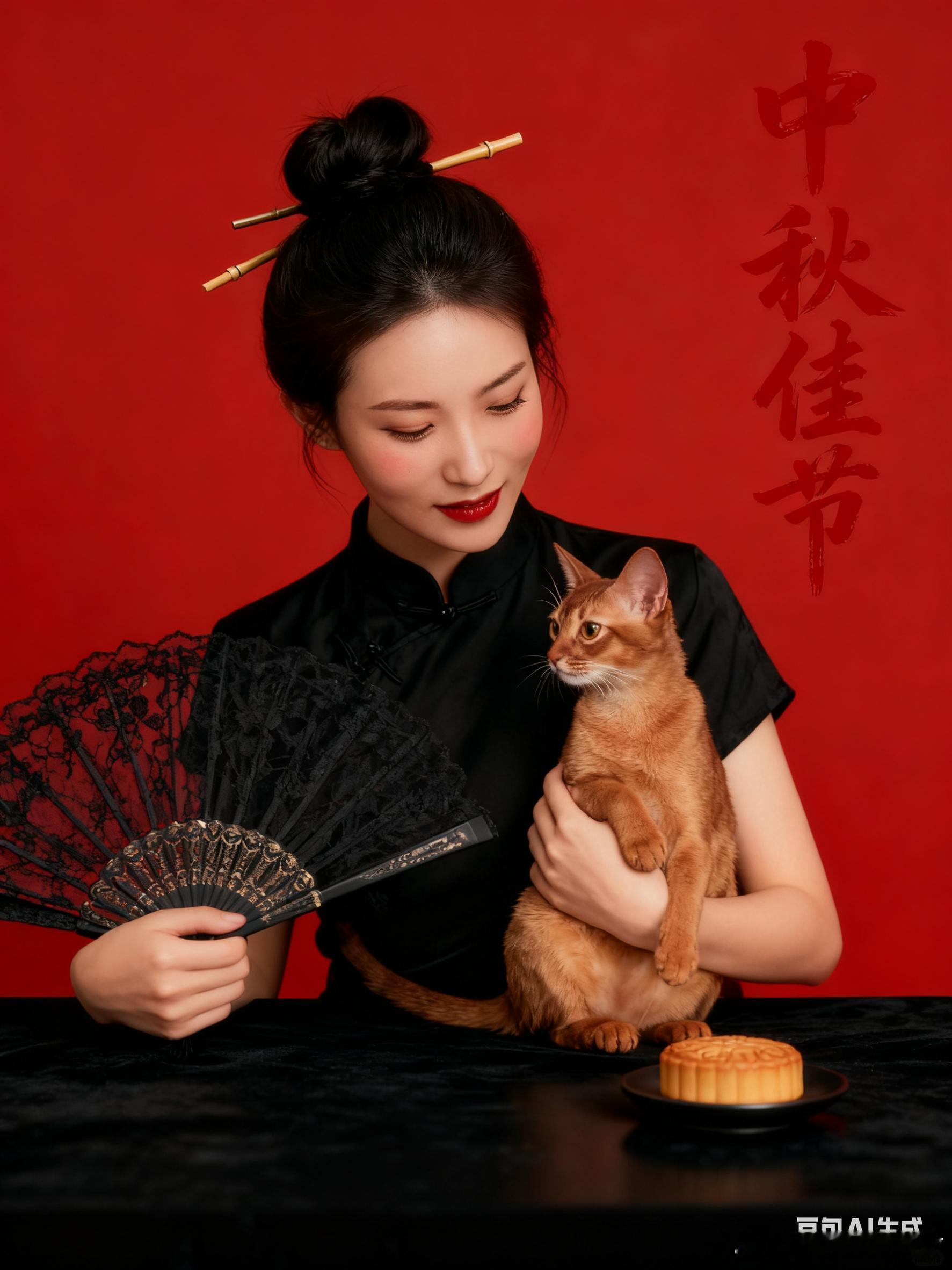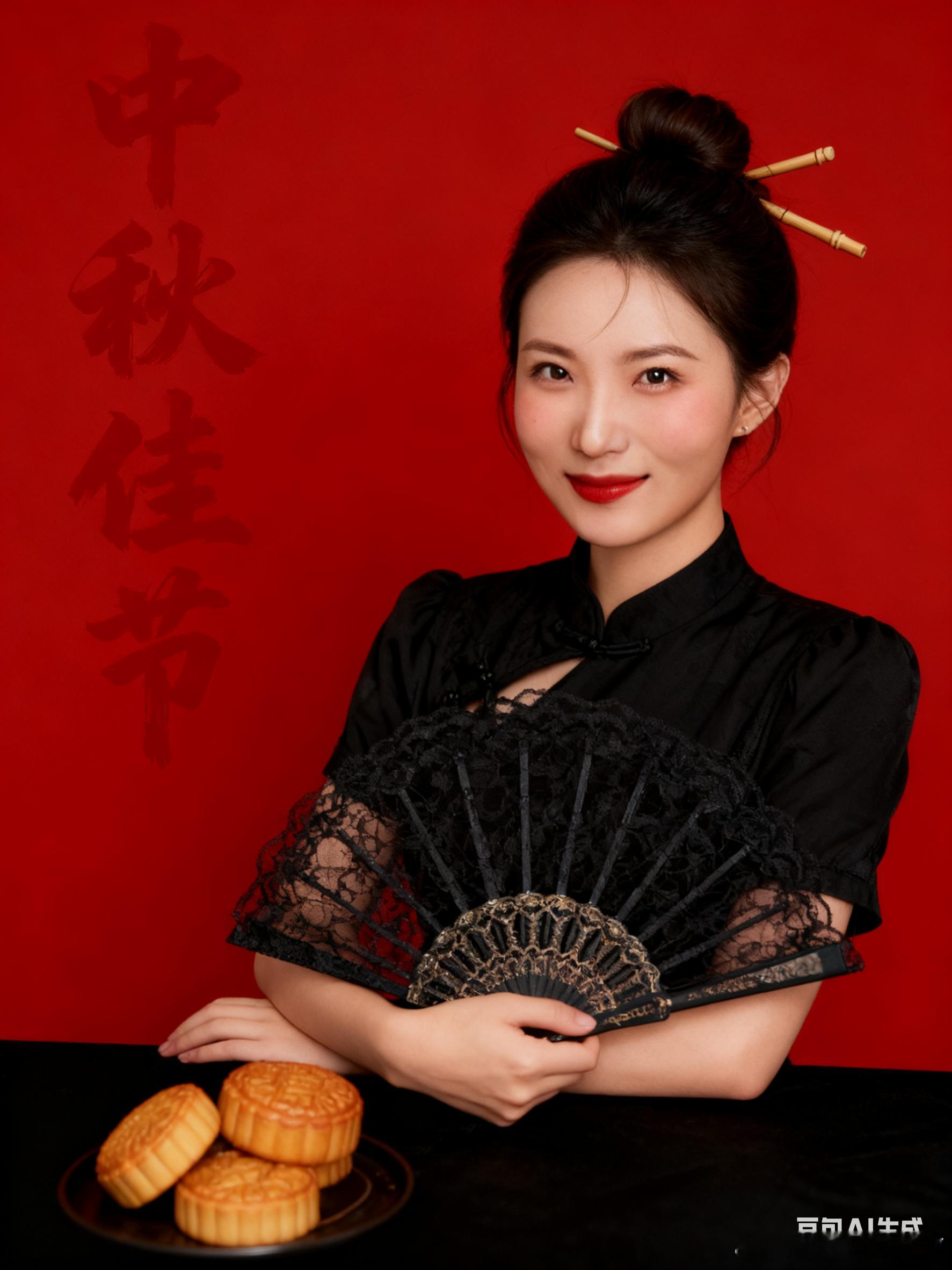 口令3:帮我生成图片:我生成9张图片,五官不变,每张呈现不同表情不同动作。女孩穿新中式国风黑色旗袍,扎新中式丸子头配新中式竹子发簪。摄影棚光,背景换成红底, 复古风,优化色彩层次。女孩坐在桌子前,桌子是黑色的,手里拿着黑色蕾丝扇子,桌子上有月饼,模拟富士相机胶片滤镜,皮肤白皙细腻通透,脸上带一点腮红,嘴唇透红。背景后面有'中秋佳节'红色书法体。表情灵动,动作多一点。比例 3:4,原比例。