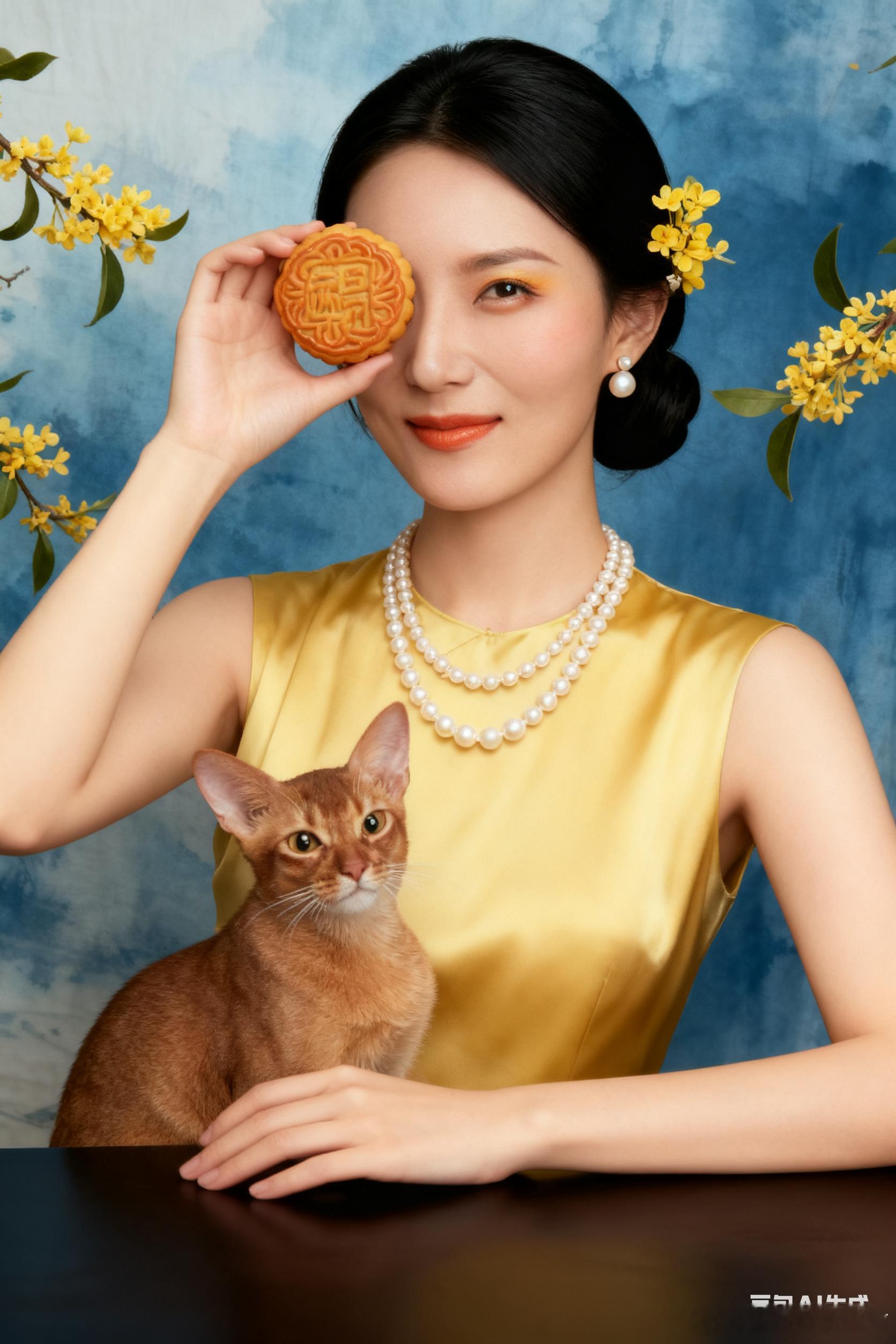 口令2:保持人脸不变。新中式中秋主题人像摄影,年轻东亚女性,白皙肌肤,黑色长发低发髻配莫兰迪黄色桂花发饰,俏皮微笑。身着莫兰迪淡黄色无袖绸缎旗袍,双层珍珠项链,珍珠耳饰。淡浅莫兰迪黄色渐变晕染眼影,浅橙色腮红,通透感浅橙色唇釉,高光打亮五官。8组动作:①右手举月饼遮右眼,左手搭深色桌面;②双手捧月饼贴脸颊;③单手托腮肘部撑桌;④侧身望桂花枝条;⑤侧身坐地,一手放竹编容器,一手撑地;⑥端坐捧满桂花的竹编容器;⑦侧身倚桌,手触花枝;⑧站桌旁捧满桂花的竹编容器。背景为莫兰迪渐变水墨蓝色布面,左右点缀黄色桂花枝条。眼神光清晰,丝绸与珍珠反光细腻。全景、中景与特写,三分法构图,人物动作、取景和角度丰富。莫兰迪黄色与莫兰迪蓝色撞色,后期保留皮肤质感,增强眼部神采,提升桂花亮度。风格融合新中式时尚美学,传递中秋团圆与青春活力氛围。