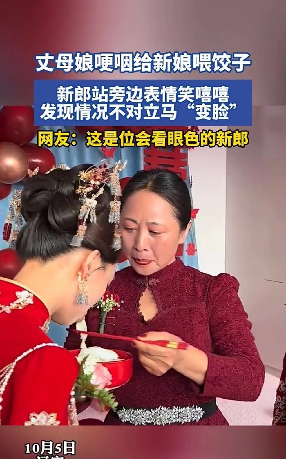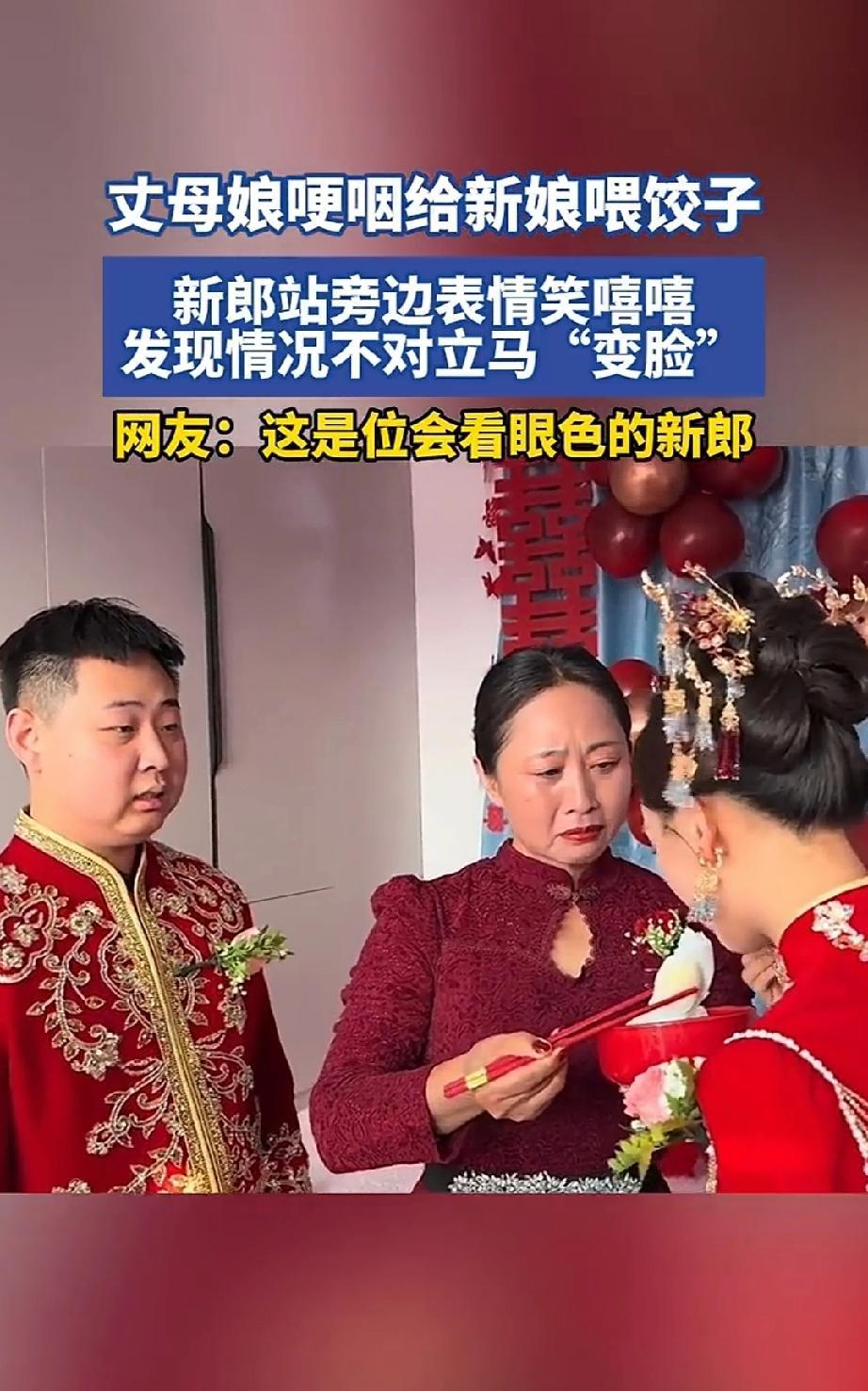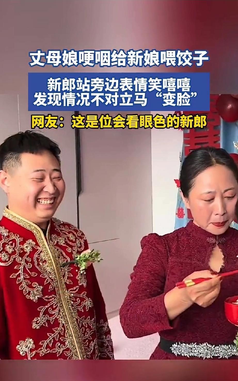 新郎正喜笑颜开看着丈母娘给女儿喂饺子时,忽然竟瞬间变得一脸悲伤,你们知道是为什么