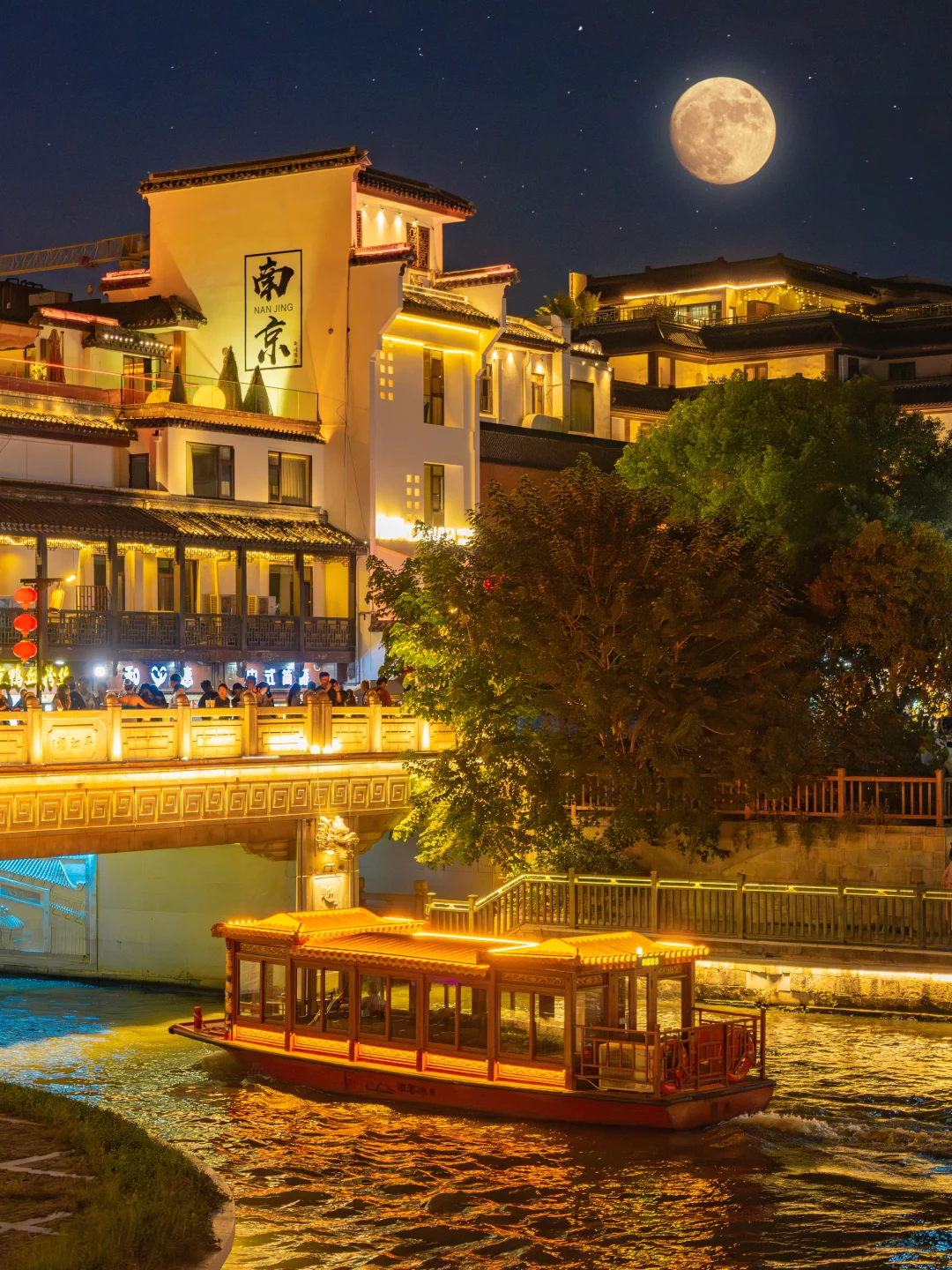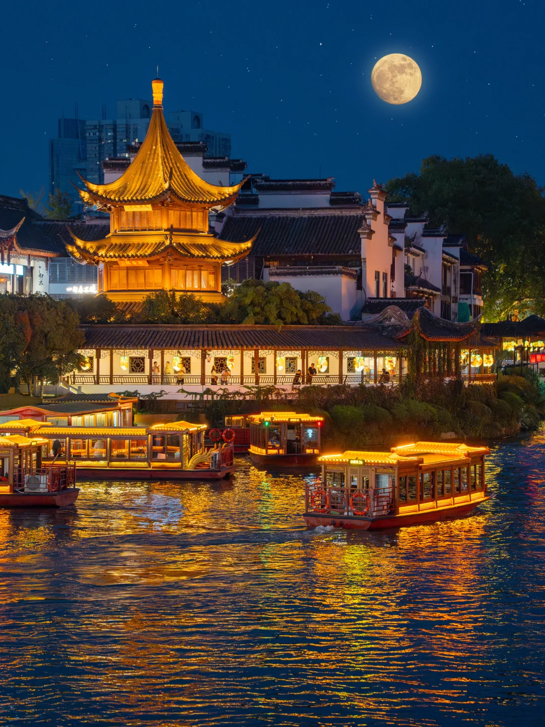 ▪️“烟笼寒水月笼沙,夜泊秦淮近酒家”,夜晚的秦淮河两岸的古建筑亮起点点灯火,游船推开水波,浆声伴着岸边的虫鸣,是语文书中金陵的模样