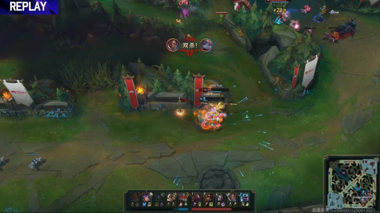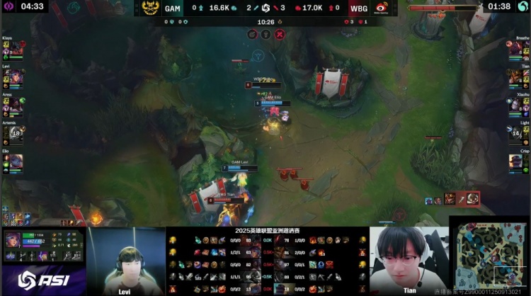 [21:41]下路混战,Levi自家野区杯Breathe赛恩逮捕,Levi交出闪现拉开,GGAM经济领先1k。随后WBG去开厄塔汗,Kiaya剑魔TP过来,双方拉开。