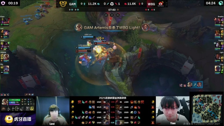 [23:36]野区团战,小天EQ火锅扣Elio波比,后者将其锤飞,随后xiaohu发条开大击杀Elio,小龙刷新,WBG吃掉小龙后撤退,GAM来开厄塔汗,WBG前来接团,Aress阿卡丽绕后,Kiaya剑魔半血开大被xiaohu开大拉出闪现,Light卢锡安跟上将其击杀,Levi莉莉娅反杀Breathe,Light卢锡安再杀Elio,Artemis飞机难逃一死,WBG打出1换3,推掉GAM中路一塔,双方经济持平。