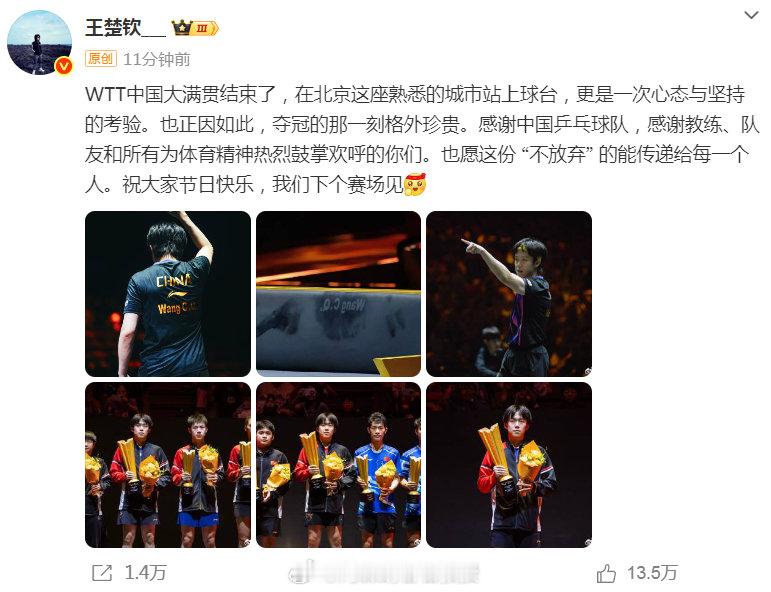 王楚钦中秋发文 王楚钦发文总结中国大满贯 王楚钦中秋节更新社媒总结中国大满贯并祝福大家中秋节快乐:WTT中国大满贯结束了,在北京这座熟悉的城市站上球台,更是一次心态与坚持的考验。也正因如此,夺冠的那一刻格外珍贵。感谢中国乒乓球队,感谢教练、队友和所有为体育精神热烈鼓掌欢呼的你们。也愿这份 “不放弃” 的能传递给每一个人。祝大家节日快乐,我们下个赛场见[努力]