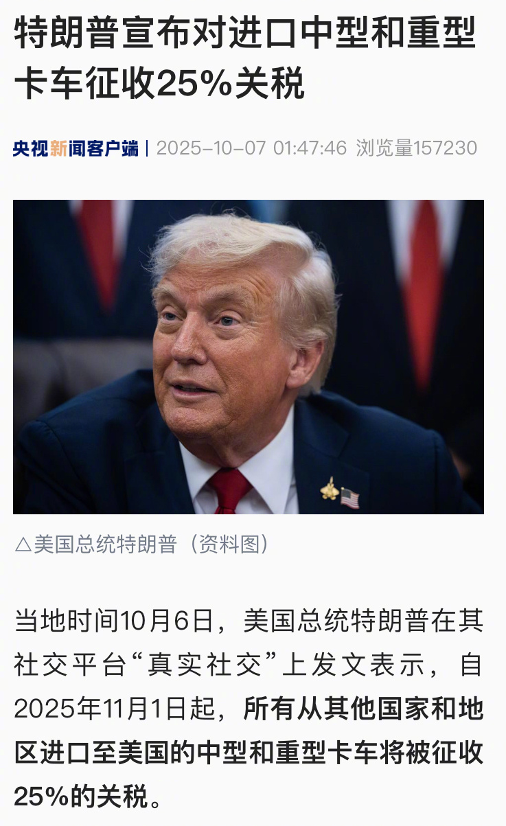 【特朗普宣布对进口中型和重型卡车征收25%关税】#特朗普称美国本可轻松赢得越战# 当地时间10月6日,美国总统特朗普在其社交平台“真实社交”上发文表示,自2025年11月1日起,所有从其他国家和地区进口至美国的中型和重型卡车将被征收25%的关税。