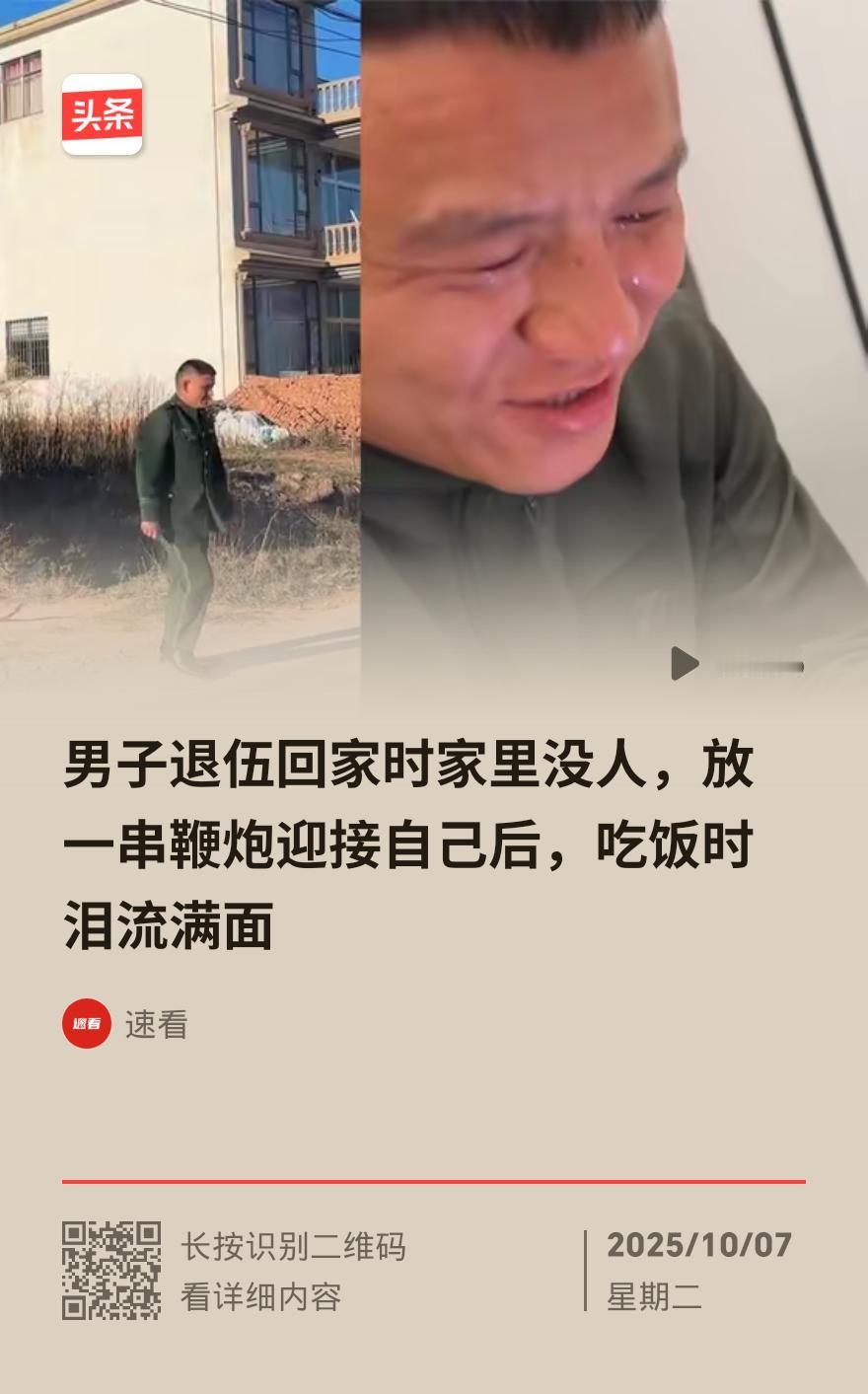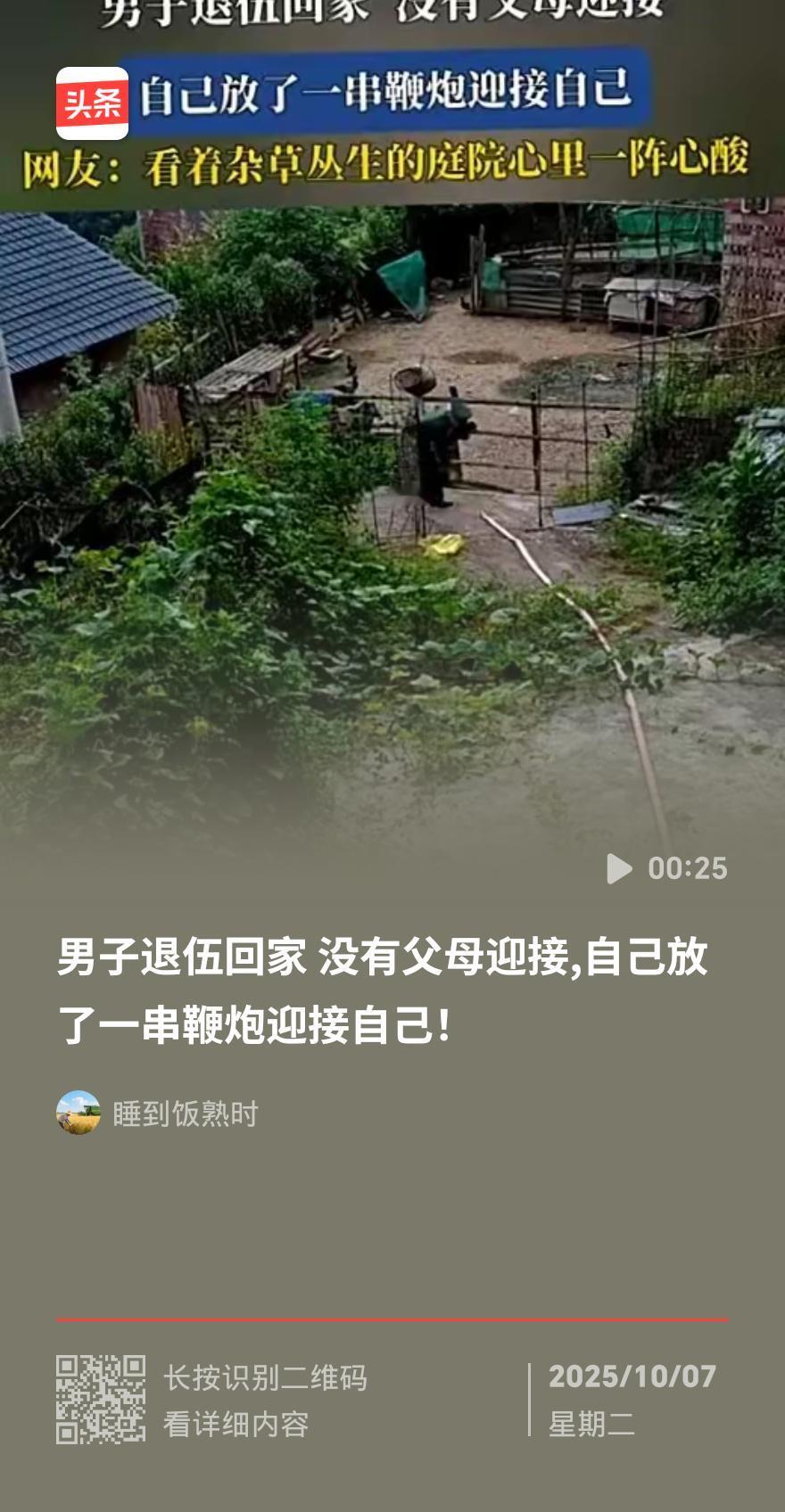 云南退伍小伙自家院点鞭炮迎自己!空房杂草没人等,视频看哭网友 9月28日中国青年报发了段视频,云南文山一个退伍小伙的回家仪式,看完让人鼻子一酸。 小伙刚从部队回来,家里没人。他先去街上买了封鞭炮,回到自家院子,把鞭炮在院里铺好,又折回院门外点燃。噼啪声在空院子里响着,他就这么一个人完成了回家的仪式。 原来他爸妈都在外地打工,没法回来接他。还是堂姐和堂姐夫去车站接的人,陪着坐车到家门口。可车一停,终究只剩他自己走进院子。院里杂草都长出来了,屋子空荡荡的,跟他之前可能幻想的不一样——谁不想回家时,能看见爸妈笑着等,家里飘着饭菜香呢? 他没抱怨,还笑着点了鞭炮。这段视频后来传到他爸妈手机上,老两口看着屏幕里的鞭炮烟,满是愧疚。小伙却没当回事,还反过来安慰。 网友看了炸开锅,有人说这场景太戳心,空院子、杂草、孤单的背影,看着就难受。也有人夸小伙坚强,没盼着啥盛大欢迎,自己给自己凑仪式感,比啥都强。还有人想起村里以前有个退伍的,乡亲们都去帮忙扫院子、备饭菜。 都是退伍回家,有人热热闹闹有人安安静静。你觉得这样的“一人仪式”,是心酸多些还是感动多些?来评论区说说你的看法。退伍男 入伍送别 战士退伍
