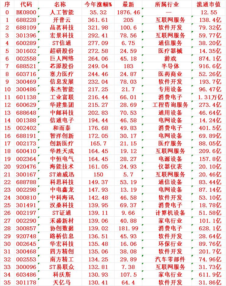 人工智能概念,2025年(九个月)以来涨幅最多的35名单 在2025年以来的涨幅排名中, 开普云位居首位,今年累计涨幅达361.61%,当前流通市值为138.4亿元。 排名第二的是品茗科技,年内涨幅为321.98%,流通市值为79.32亿元。 第三名为宏景科技,涨幅292.41%,流通市值59.77亿元。 第四名是ST信通,今年上涨277.09%,流通市值为38.20亿元。 第五名为超研股份,涨幅272.58%,流通市值为14.35亿元。 第六名为巨人网络,年内涨幅264.06%,流通市值高达874.1亿元。