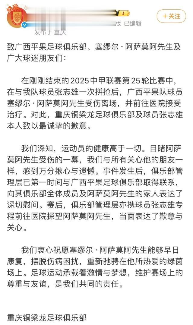 对此,重庆铜梁龙足球俱乐部6日凌晨已率先微博发文致歉,塞缪尔·阿萨莫阿和张志雄碰撞定性为:一次拼抢,并表示俱乐部管理层已第一时间与广西平果取得联系,表达慰问并探望了阿萨莫阿。