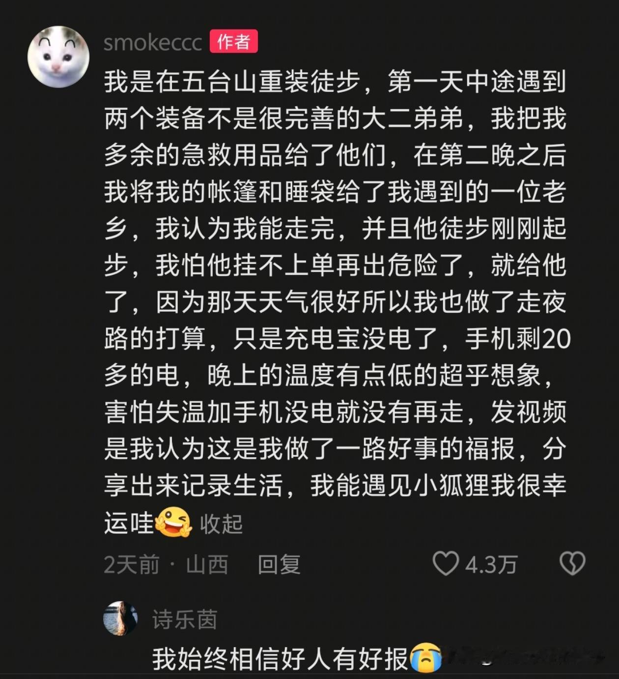 彻底解释不清了!男子夜晚在五台山徒步下山,正担心手机没电快关机时,一只狐狸却突然出现,本来还不知道狐狸的意图,于是男子就好奇的跟着狐狸走了几步路,发现狐狸走几步就回头,好像是真的在给他带路。 大概走了10多分钟后,小狐狸竟然真的给男子带到山下了,正是他徒步的起点! 专家解释说,狐狸是不会主动带路的,可能是碰巧和它觅食的路线相同,或者以前有人投喂过它,频繁回头是乞食。 不过比起专家的解释,我更愿意相信万物皆有灵,好人有好报! 男子本来携带的装备很齐全,但是在路上看见有人需要帮助,就陆续把他的急救用品,帐篷和睡袋给别人了,在快下山碰到困境时,也得到了小动物的帮助,男子认为这是他做好事的回报! 有网友评论,小伙是个行善积德的人,这是山神派来的引路狐仙。 由心而论,只要结果是美好的,那就是唯一正确答案,无需听任何人解释!