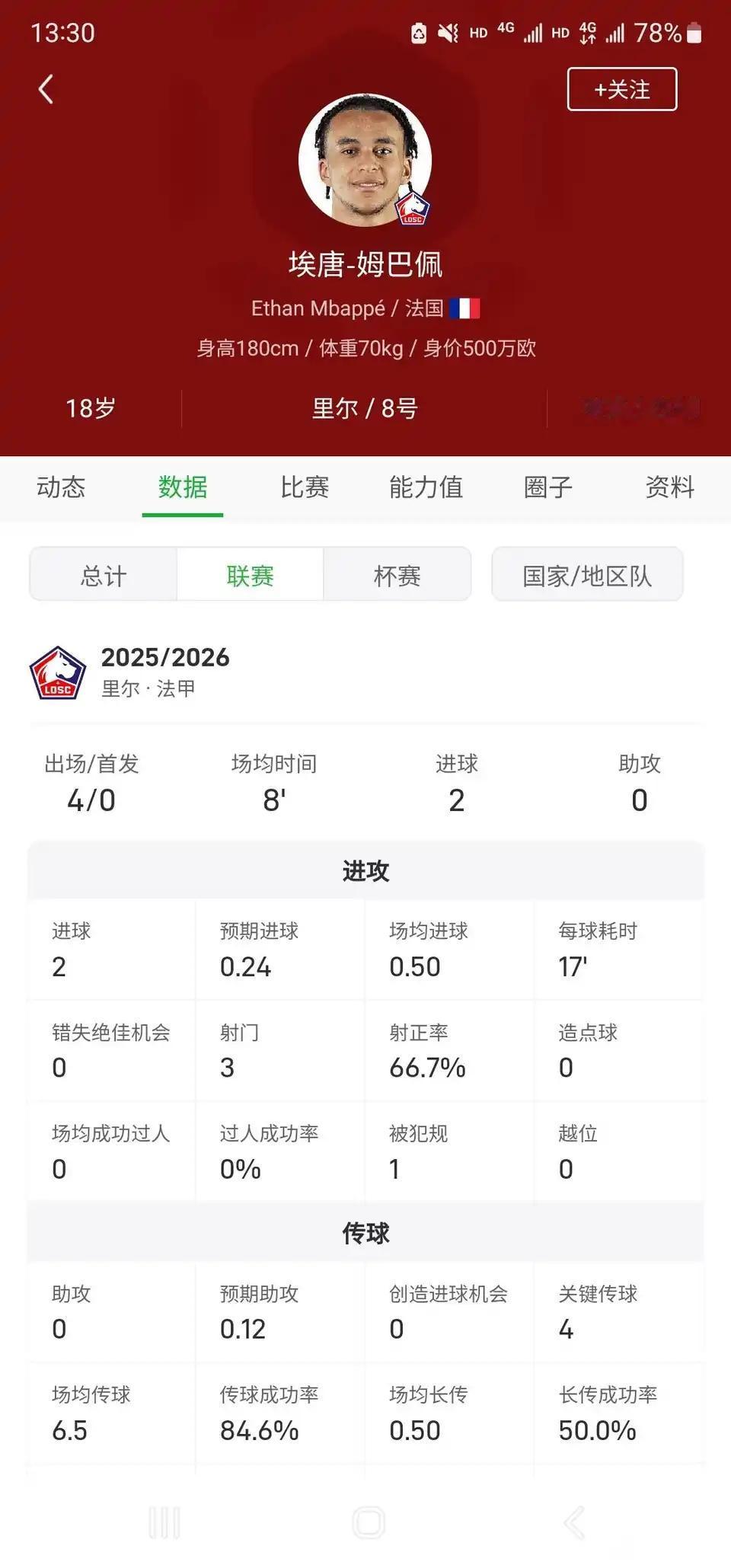 姆巴佩弟弟18岁了,将来也能进豪门吗? 作为中场在法甲打进2个球,数据还不错。