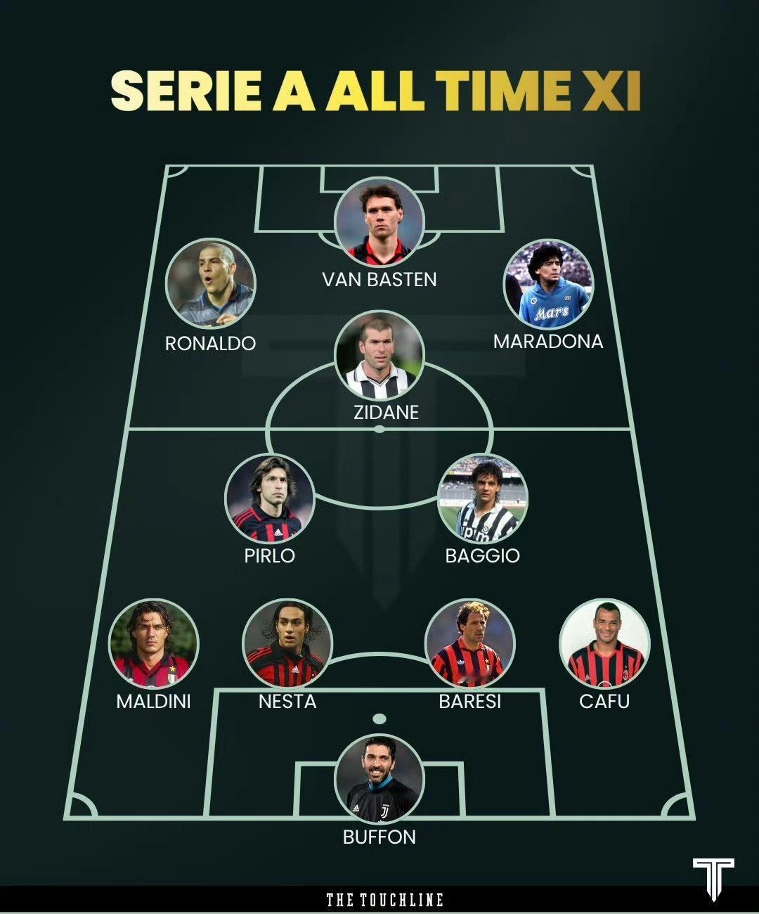 意甲联赛历史最佳阵容,能拿几个欧冠? 锋线范巴斯滕,他28岁退役,那会就拿3个金球奖了。 大罗和马拉多纳两边。 齐达内,皮尔洛,巴乔的中场。 后卫全是AC米兰名宿,感觉想起了2005年欧冠决赛,当然那会没巴雷西。 门将布冯。 三个欧冠冠军还是得有的。[灵光一闪]