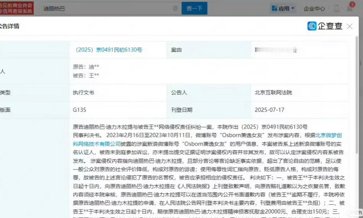 这个id眼熟吗?被迪丽热巴热巴告了、要赔偿2w,没出庭。