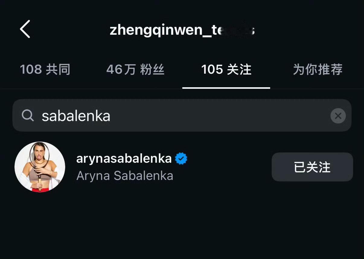 昨晚武网开幕式热聊之后,郑钦文与萨巴伦卡在ins上立马互相关注了。 郑钦文的粉丝仅仅46万,虎妞的粉丝高达380万,可能因为ins是国外的吧。
