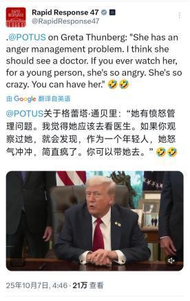美国总统特朗普今天(北京时间10月7日)对格蕾塔·通贝里在前往加沙的援助船队上被以色列军队拘留做出回应:“她有愤怒管理问题。我觉得她应该去看医生。如果你观察过她,就会发现,作为一个年轻人,她怒气冲冲,简直疯了。你可以带她去。” 特朗普这句针对格蕾塔·通贝里的回应,不过是他一贯亲以立场与对批评者人身攻击风格的又一次暴露。 北京时间10月7日,当“环保少女”格蕾塔·通贝里因搭乘人道主义援助船队前往加沙被以色列军队拘留的消息传出时,这位美国总统的反应既不意外,也毫无新意。 他既没有对以色列的拘留行为提出任何质疑,也没有关注加沙正在恶化的人道危机,反而将矛头对准通贝里本人,用“愤怒管理问题”“应该去看医生”“怒气冲冲简直疯了”这类充满人身攻击的词汇,试图通过抹黑批评者来转移焦点。 这种操作手法,其实和他处理国际争议时的套路如出一辙,本质上都是为了巩固自己的政治基本盘,同时向以色列传递无条件支持的信号。 要理解这场争议的核心,首先得搞清楚格蕾塔此行的来龙去脉。早在2025年6月,她就与11名志愿者一起从意大利西西里岛启航,搭乘“马德琳”号向加沙运送婴儿奶粉、面粉、大米、医疗用品和净水设备等急需物资。 这艘船属于“自由船队联盟”,这个组织近二十年来多次试图突破以色列对加沙的陆海封锁,2010年他们的船队就曾在国际水域遭到以军袭击,导致10人死亡,而2025年5月,同联盟的“良心”号又在马耳他附近遭无人机袭击,所有证据都指向以色列。 即便面临这样的风险,通贝里依然坚持行动,她在采访中明确表示“我们是和平志愿者,不携带武器,是合法地在国际水域航行”,同时直言西方政府“背叛了巴勒斯坦人民”,“我们缴纳的税金、我们的媒体都在助长这场暴行”。 这种对人道主义危机的直接介入,显然触动了那些不愿正视以色列封锁政策争议的势力,而特朗普就是其中最典型的代表。 2025年10月正值加沙人道危机加剧之际,国际社会已有6.5万巴勒斯坦人在冲突中丧生,其中绝大多数是妇女和儿童,多国民众纷纷走上街头抗议,伦敦一天就有442人因抗议被捕,雅典、柏林、巴黎等欧洲城市也爆发大规模示威,要求停止对以色列的武器支持并解除加沙封锁。 但特朗普对此视而不见,反而选择在格蕾塔被拘留时发动人身攻击,这背后既有政治算计,也有根深蒂固的意识形态偏见——对他而言,任何批评以色列政策的声音都等同于“敌人”,必须用抹黑的方式予以压制。 更值得玩味的是,特朗普这种转移焦点的策略,恰好暴露了以色列对加沙封锁政策的脆弱性。 以色列声称封锁加沙是为了“防止武器走私”,但事实上,这种持续多年的封锁已经导致加沙陷入严重饥荒和人道主义灾难,国际红十字会等机构多次警告当地医疗系统濒临崩溃,基本生活物资极度匮乏。格蕾塔运送的婴儿奶粉和净水设备,正是当地儿童生存的迫切需求。 而以色列选择在国际水域拘留和平运送救援物资的志愿者,本身就涉嫌违反国际法,这也是为什么联合国多个机构和欧盟部分国家都对封锁政策提出批评。 特朗普回避这些核心争议,转而攻击通贝里的“愤怒”,本质上是想用个人品格抹黑来掩盖政策本身的道德缺陷。 毕竟,当一个16岁就开始为气候危机发声的年轻人,看到加沙儿童因缺乏奶粉而夭折时,她的愤怒难道不是最正常的人性反应?而那些对这种苦难无动于衷,反而嘲笑抗议者的人,才真正需要反思自己的道德底线。 回顾特朗普的政治生涯,这种对批评者进行人身攻击的手法早已屡见不鲜。他曾嘲笑残疾记者、给政治对手起侮辱性绰号、贬低女性领导人,如今把同样的套路用在格蕾塔身上,不过是故技重施。 但这次的区别在于,格蕾塔代表的不是某个政治派别,而是国际社会对人道主义危机的基本关切。 说白了,特朗普的回应从来都不是针对格蕾塔个人,而是针对所有敢于质疑以色列政策的声音。他试图通过给批评者贴上“疯子”“有精神问题”的标签,来消解他们诉求的正当性,从而为以色列的行为背书。 但这种做法已经越来越不得人心,2025年10月欧洲多国爆发的抗议潮就是明证,越来越多的人开始意识到,支持巴勒斯坦人民的生存权,并不等于反对以色列的存在,而是反对用封锁和暴力制造人道灾难的政策。 特朗普的亲以立场或许能讨好他的政治基本盘,但却无法掩盖加沙正在发生的悲剧,更无法阻止国际社会对人道主义正义的追求。
