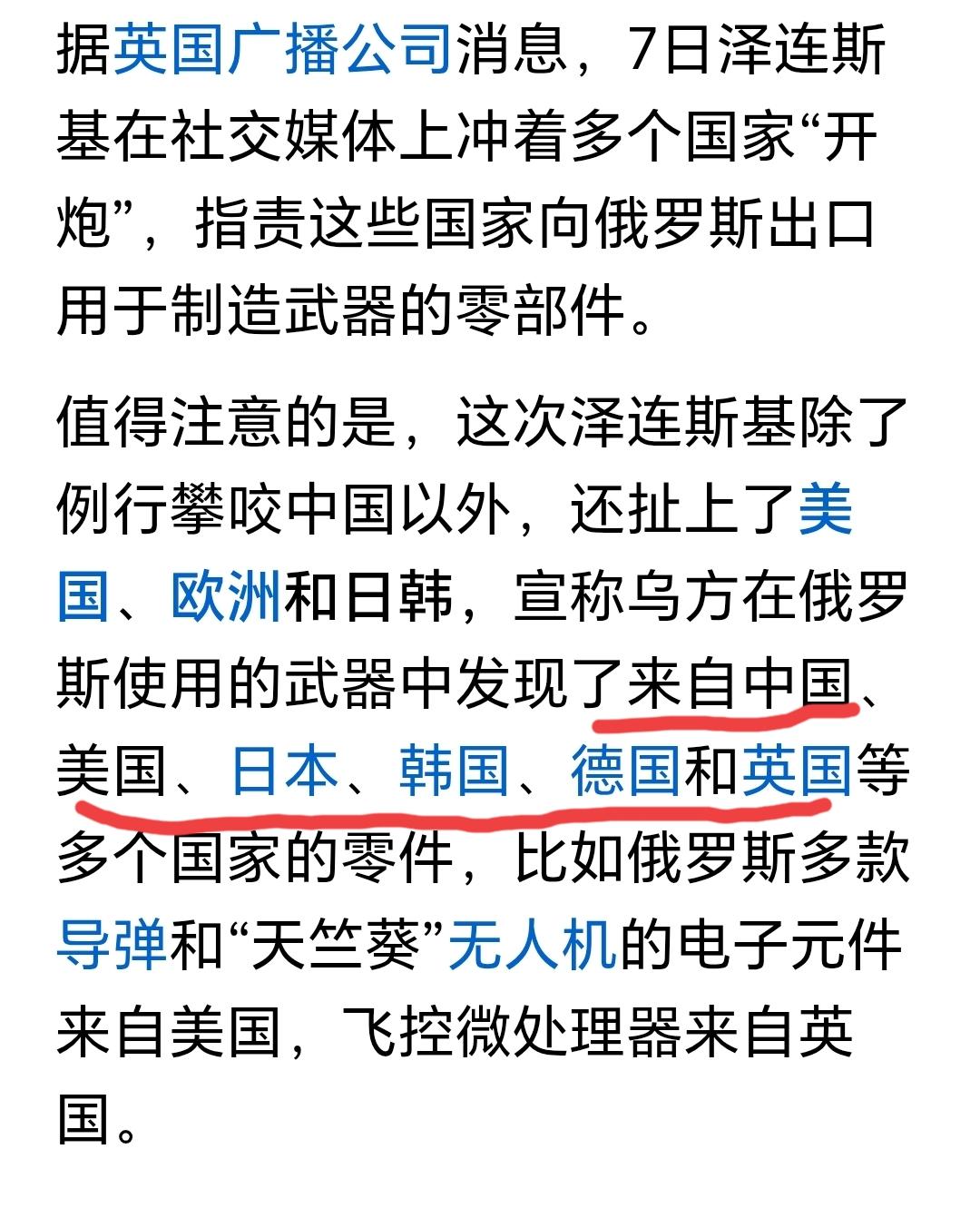 这下泽连斯基尴尬了。全世界都在暗中支持俄罗斯。其实他也不尴尬,毕竟是他自己说出来的。 他列举了一大堆国家给俄罗斯提供武器零件。就是现在世界上这些绕不开的工业国啊。基本上除了法国以外都在给俄罗斯供货。 当初说好的,谁和俄罗斯交易就制裁谁呢? 结果现在美国、英国、德国、日本、韩国、中国都在供货给俄罗斯呢? 这可怎么办? 估计在一些乌克兰没有得到的设备中还有法国、意大利、瑞典、西班牙的零件。 哈哈,原来天下无人不通俄。 原来小丑竟是你自己。 点右上角关注我,我们一起去看这个魔幻的世界