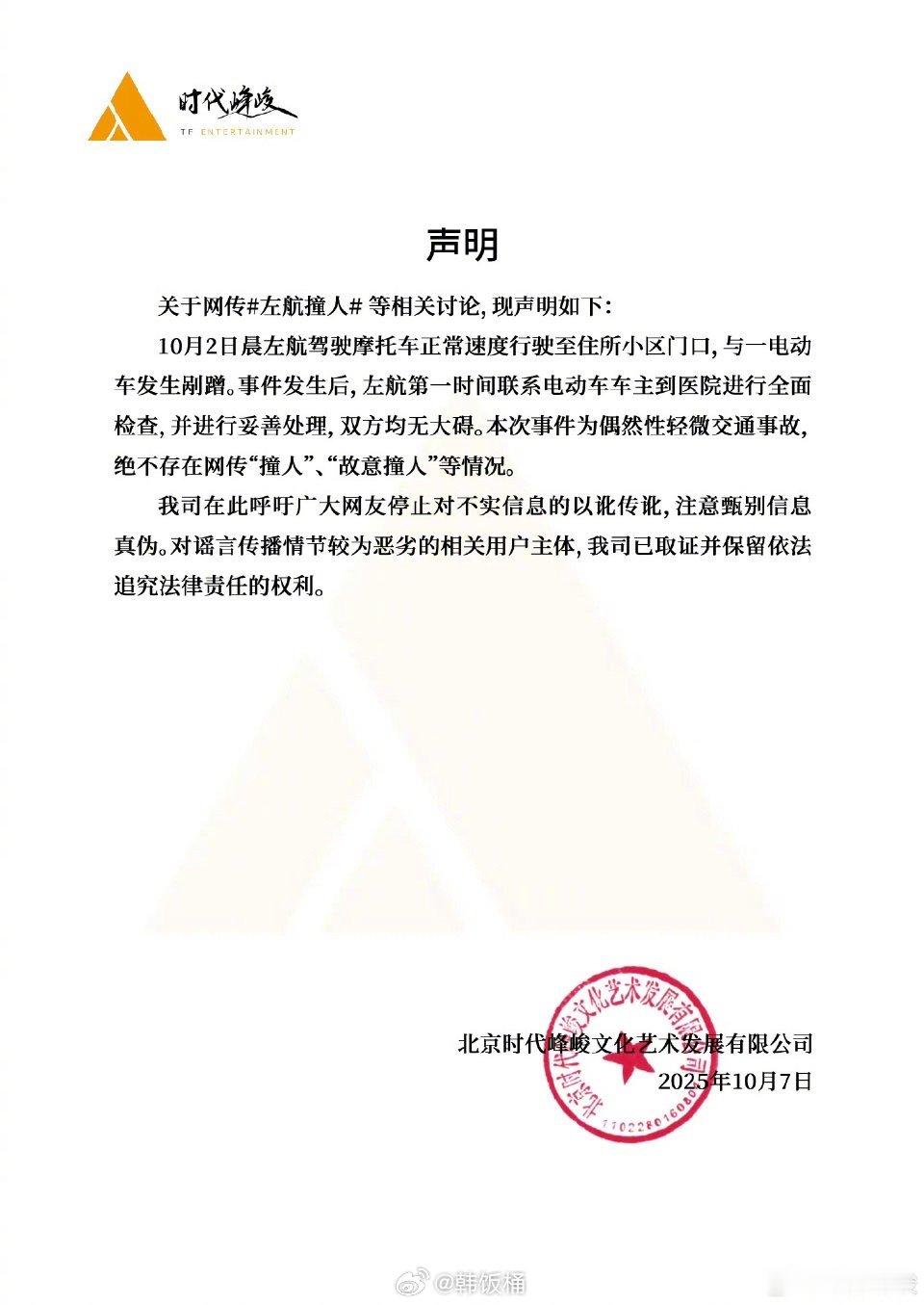 时代峰峻回应了,辟谣左航撞人、故意撞人