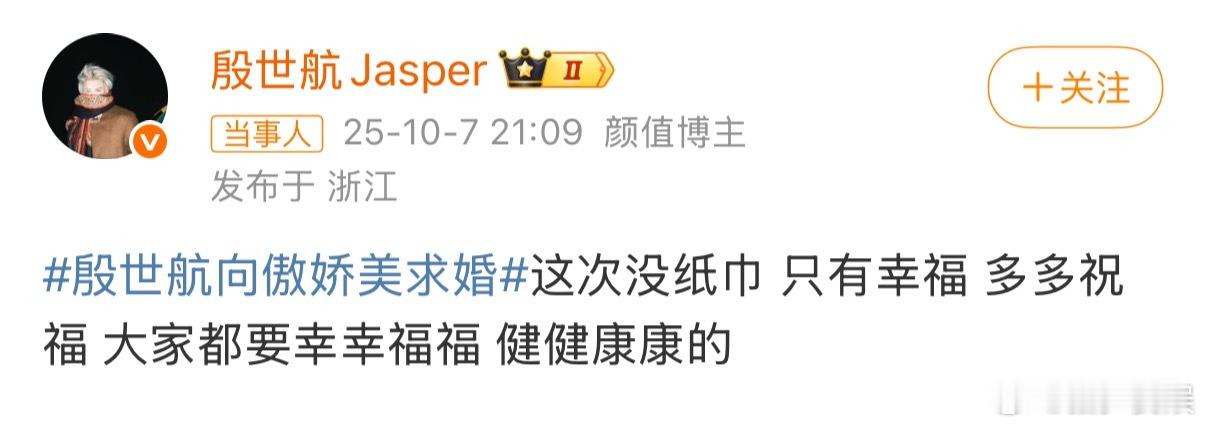 殷世航向傲娇美求婚妈妈呀,再次知道殷世航的事情竟然是因为他求婚了!!!对他上次和套璐璐在直播间卖纸还记忆犹新呢,不过他这次真的好认真,应该会幸福的吧,祝福