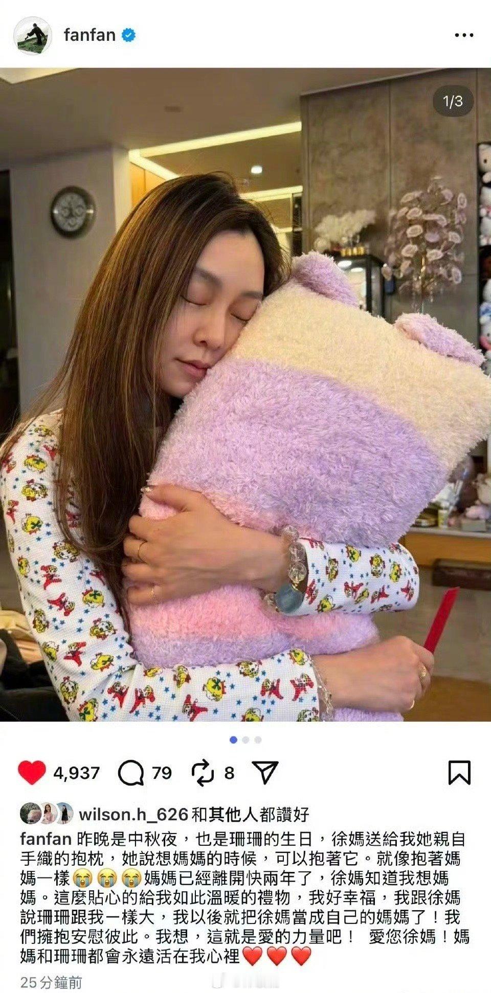s妈中秋亲手做抱枕送给范玮琪,说想妈妈的时候可以抱着她,就像抱着妈妈一样