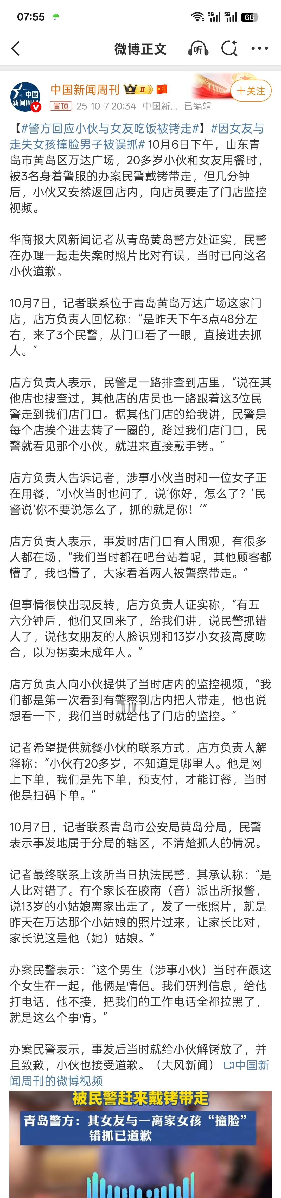 警方回应小伙与女友吃饭被铐走解释的很详细,警方抓错人了,并向小伙道歉,小伙很快就回到店里……
