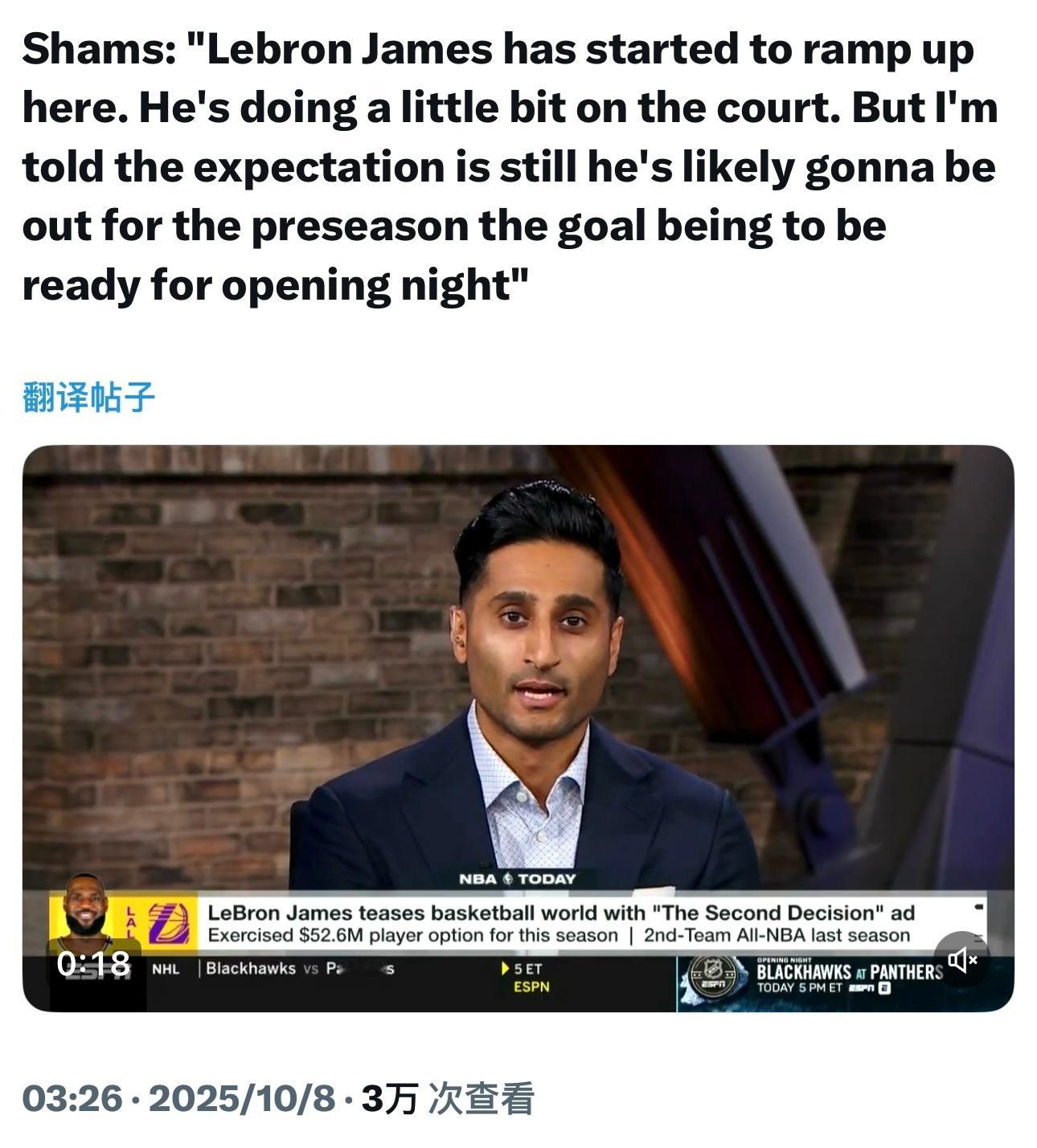 Shams:“勒布朗·詹姆斯逐步增加训练量,目前已进行少量场地训练。但据消息人士透露,他大概率仍将缺席整个季前赛,首要目标是赶上常规赛揭幕战。”