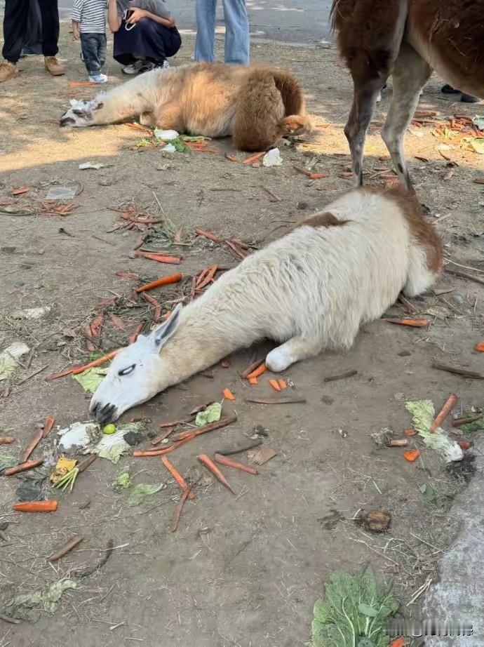某动物园里面的羊驼,吃游客投喂的东西太多了,趴在地上都不愿意动弹,不知道这样的暴