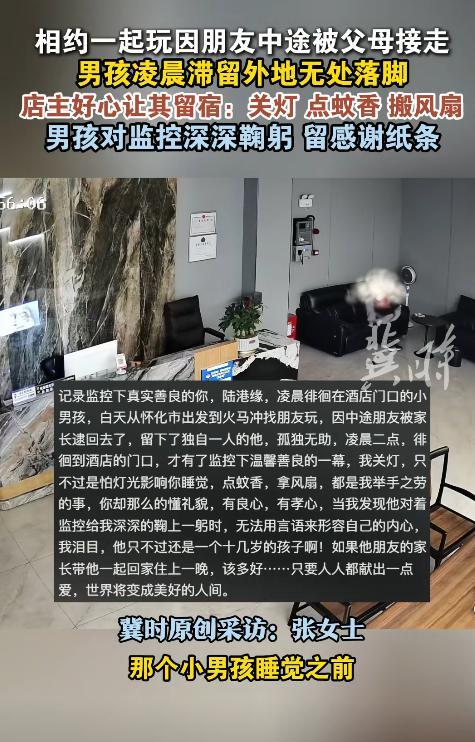 湖南怀化近日,一个15岁男孩在一家宾馆门口徘徊了许久,最终鼓起勇气走进店里,询问老板娘能否让他在沙发上休息一晚,老板娘猜测男孩是遇到困难了,也心疼他小小年纪不容易,于是爽快地答应了。 国庆假期终于到来,小李(化名)早早地就收拾好行李,和同学约好一起去一个热门旅游城市放松几天,两人计划好了路线:先去景区爬山,再去老街品尝当地美食,晚上还打算去看一场灯光秀。 小李满心期待这次旅行,不仅想着和好友畅聊,也想着趁假期好好放松一下,暂时逃离繁忙的学业。 按照约定的时间,他们准时抵达了目的地,小李兴奋地四处张望,想着接下来的几天一定会精彩无比。 他和同学打趣着,“等会儿拍照可不能输给我哦!”两人都笑得很开心,仿佛整个城市都充满了节日的欢快。 可是,就在他们准备踏上第一站的旅游巴士时,情况却突然发生了变化,小李的同学低头接了一个电话,神色逐渐凝重。 挂了电话后,同学小声对小李说:“不好意思,我得回家了……爸妈来找我接我回去了。” 小李一时愣住,完全没反应过来:“什么?你爸妈把你叫走?现在?我们都到了啊!” 等不及小李反应,同学已经被他的父母给接走了,留下了小李一个人孤零零的站在陌生的城市,不知所措。 夜晚的时候,他在一家宾馆门口徘徊了很久很久,因为自己没有钱住宾馆,所以想着在他们大厅留宿一晚,但是又担心被拒绝,犹豫了很久之后,最终还是小心翼翼的进去了。 老板娘听到动静出来之后,小李小心翼翼的说道:能不能让他在大堂的沙发上,将就一晚? 老板娘没有刨根问底,她只是看着眼前这个和自己孩子差不多大的少年,心里一阵心疼,猜测他一定是遇上了难处,她几乎没有犹豫,非常爽快地就答应了。 她怕男孩热,特意搬来一台风扇对着沙发吹;怕有蚊子,又为他点上了蚊香;临走前,还体贴地把大堂的灯给关了,只为让他能睡得安稳一些。 而少年呢?他接受了这份善意,却用自己的方式,给出了最体面的回应。就在他准备躺下的时候,他从自己的包里,郑重地取出一双干净的袜子换上。 第二天清晨,老板娘来到大堂时,少年早已悄然离开。他不想打扰任何人,只是在前台留下了一张纸条,上面写着对“姐姐”的感谢。 但真正让人破防的,是事后调取监控才发现的一幕。 少年在离开宾馆前,特意走到了监控摄像头的下面,对着摄像头深深地鞠了一躬,他不知道这一幕会不会被人看见,他也不是在表演给谁看。 当老板娘看到这个画面时,眼泪瞬间就流了下来,她被感动的,不只是那声谢谢,更是少年身上那份知恩图报、严于律己的宝贵品格,这份迟到的、无声的感谢,力量万钧。 她没想到随手帮助的这个小男孩,这么的有礼貌,有教养。 信息来源:冀时