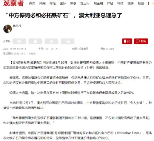 被中方反制后,澳大利亚才发现!据了解,本周中方已经将必和必拓美元计价的铁矿石全停了,连在海上飘的货都没例外。 必和必拓这公司在澳大利亚可不是普通角色,铁矿石业务常年都是它的 “现金牛”,2025 财年光是铁矿石就贡献了集团 53% 的利润,等于大半个公司都靠卖铁矿活着。 它在西澳皮尔巴拉的矿区一年能产 2.9 亿吨铁矿,其中 60% 都卖到了中国,算下来对华年出口量差不多 1.2 亿吨,占了中国进口总量近一成。 以前总觉得自己握着高品位铁矿就能横着走,跟力拓、FMG 两家一起把铁矿石价格攥得死死的,哪怕今年全球供应多了、中国需求放缓,价格跌了两成,也不肯在谈判桌上松口,一门心思要维持垄断定价。 这下好了,订单说停就停,必和必拓当天股价就暴跌 6%,市值一下蒸发掉上百亿美元,账上的现金流瞬间就紧张起来。 澳大利亚整个国家的经济更是被这一下打懵了。2024-2025 财年澳大利亚铁矿石出口收益高达 1160 亿澳元,占对华出口总额的六成以上,这生意可是澳大利亚最赚钱的门道,等于全国的经济命脉都拴在铁矿石上,而这命脉的开关又捏在中国手里。 西澳的矿区已经堆起了万吨滞港的船货,港口起重机停在那儿没人用,下游的冶炼厂因为原料断供,只能被迫减产,数十万靠着铁矿产业链吃饭的从业者眼看着收入要缩水,不少人已经开始担心饭碗保不住。 澳总理阿尔巴尼斯第一时间就跳出来表态,嘴上说着 “失望”,话里话外却全是求缓和的意思,一个劲儿强调铁矿石对中澳经济多重要,盼着这措施是暂时的,还盼着货物能 “不受阻碍地出口到中国”。 这副姿态跟之前的强硬完全不一样,明眼人都能看出来是急了,毕竟国内的压力已经快顶不住了。矿企巨头们天天找政府要说法,地方政府也跟着施压,毕竟铁矿产业可是不少州的税收大头,现在订单停了,地方财政都要受影响。 慌了神的澳大利亚还想着找盟友搭救,给好几个国家发了求助信号,想把这些铁矿转卖给别人,结果碰了一鼻子灰。 有个欧洲国家直接回话说 “不会为单一国家打破贸易平衡”,压根不想接这个烫手山芋。东南亚市场倒是有点意向,可他们要么产能跟不上,要么运输成本太高,根本没法快速补上中国这么大的缺口。 后来才有人算明白,要是真打算培育印度、日本这些替代市场,至少得花五年时间,再砸进去数百亿美元建配套设施,这根本就是远水解不了近渴,短期内想把中国这个市场的缺口补上,纯属做梦。 这时候澳大利亚才慢慢回过味来,中方这步棋根本不是临时起意,早就是有备而来。以前澳大利亚总觉得中国离不开高品位铁矿,自己能靠着垄断地位拿捏价格,还死咬着美元结算不放,压根没把中方的谈判诉求当回事。 可他们不知道,中国早就悄悄布局了替代方案,不光和巴西淡水河谷这些企业搞成了人民币结算的试点,几内亚的西芒杜铁矿项目还能提供每年 1.2 亿吨的产能,完全能顶上空缺。 中国矿产资源集团成立的初衷就是抱团采购,就是为了打破澳方的定价垄断,这次停单不过是把藏在手里的底牌亮了出来。 更让澳大利亚闹心的是,这事儿不光是生意上的摩擦,更是戳破了他们一直以来的幻觉。以前总觉得跟着美国后面,在贸易上摆摆架子、设点壁垒没关系,反正中国最后还得买铁矿。 可真等订单停了才发现,自己的经济结构早被单一资源出口捆死了,85% 的铁矿石都要靠中国消化,这种依赖程度根本经不起任何风吹草动。 所谓的 “资源优势” 说白了就是看中国脸色吃饭,一旦中国不想惯着了,之前的定价权、结算权全都成了泡影。 现在澳大利亚国内已经开始出现各种抱怨声,有人说早该跟中国好好谈,不该在价格上那么强硬;有人骂政府太依赖美国,搞砸了对华关系;还有从业者担心要是订单一直停着,自己可能要失业。 可这些话现在说都晚了,中方已经把态度摆得很明白,不想再接受单方面的价格操纵,也希望能建立公平的价格机制,甚至在推动人民币成为大宗商品贸易的结算货币,必和必拓要是不松口接受浮动价格和人民币结算的混合模式,这生意怕是很难重启。 说到底,澳大利亚这次算是吃了个大亏才看清现实。以前总觉得自己握着资源就能高枕无忧,把中国的长期采购当成了理所当然,既想赚中国的钱,又不想平等合作,还在结算货币上跟美元霸权绑在一起。 直到中方真的动手反制,订单停了、市值跌了、产业慌了,才后知后觉地发现,自己早就没了讨价还价的资本,所谓的 “优势” 不过是建立在中方的包容之上。要是还看不清形势,继续抱着过去的老想法,将来吃的亏只会更大。 现在外界都在看澳大利亚接下来怎么选,是放下身段好好谈判,还是继续硬撑着找不切实际的替代方案。 澳大利亚这波算是用真金白银买了个教训,就是不知道这个教训能不能让他们真正清醒过来。