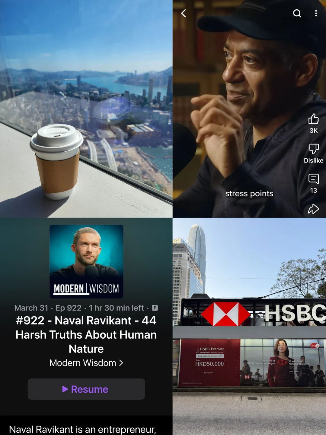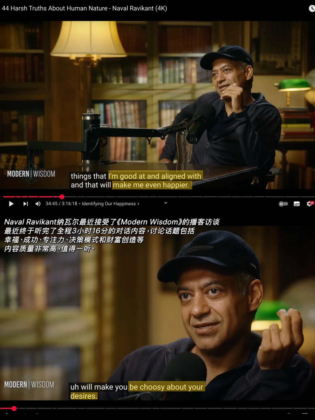 以上来自《Modern Wisdom》播客。建议可多关注类似实用性强的信息。关于财富思维,纳瓦尔提到财富自由即时间的自由、选择的自由、不必听命于人的自由。最近听佘诗曼的采访中也提到“财富自由=人生自由”的观念,懂理财也持续投资自己。