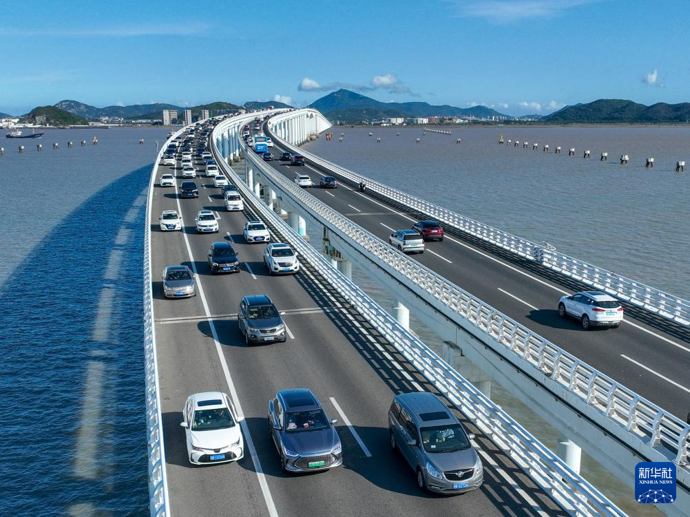 图9:在浙江省舟山市普陀区,返程车辆行驶在朱家尖海峡大桥上(无人机照片)。(新华社)#假期后劲太大了#