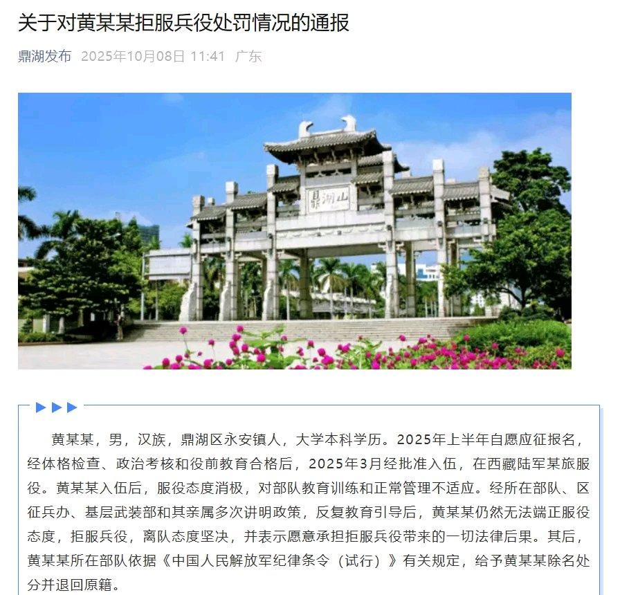10月8日,广东肇庆鼎湖区征兵办通报了黄某某拒服兵役的处罚情况。黄某某本科学历,2025年3月入伍西藏陆军某旅,可入伍后态度消极,不适应部队管理。经多方教育,他仍拒服兵役,部队对其除名并退回原籍。 区政府依规对他进行处罚,罚款3万,两年内不得升学,还将他纳入严重失信主体名单并公开,撤销其家庭义务兵优待。义务兵役是公民责任,随意逃避不仅受罚,还会留不良记录,这警示大家要慎重对待服兵役承诺。