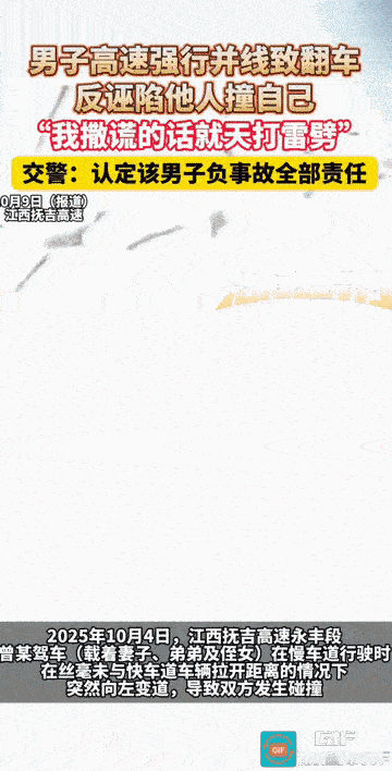 “我撒谎的话就天打雷劈!”事故发生后,男子在交警面前信誓旦旦地发誓,指责对方车辆撞了自己。然而,警方面对他如此强词夺理的诬陷他人,直接当场亮出当时的监控视频,啪啪打脸男子! 来源:【法治进行时】 此事发生于2025年10月4日,男子驾车载着妻子、弟弟和侄女行驶至江西抚吉高速永丰段时,原本在慢车道行驶的男子,在丝毫未与快车道车辆拉开距离的情况下,他突然向左强行变道! 这一鲁莽举动导致两车发生猛烈碰撞,男子的车辆瞬间失控,四轮朝天在路面上连续翻滚数圈才停下。最后导致他的妻子、弟弟不幸骨折,侄女受了皮外伤,万幸的是均无生命危险! 尽管自己是事故的肇事者,男子却选择反咬一口! 他不仅坚称自己无错,还诬赖对方车辆进入自己的车道撞了他! 面对民警的询问,曾某信心十足地保证:“我100%负责!” 甚至在交警查看监控前,他还用手指着天发誓:“我撒谎的话天打雷劈!” 而男子的妻子也积极配合丈夫的谎言,给交警发信息指责对方司机占道行驶! 她情绪化地写道:“你们要公平公正对待我们,我们这边人受伤已经很严重了,人都要凭良心!” 试图以家人受伤为借口,向交警施加压力,企图颠倒黑白。面对这对夫妇的狡辩,交警直接展示了无可辩驳的证据——监控画面和对方行车记录仪记录! 视频清晰显示,正是男子的车辆突然向中间车道靠拢,导致事故发生! 铁证如山,交警对男子进行了严厉的批评教育,并明确指出了其违法变道的事实! 最终,交警依据调查结果认定该男子负事故全部责任! 铁证如山,男子的誓言在监控面前不仅不堪一击,更是显得可笑至极! 他们大概忘记了现在是什么年代了,还真以为卖卖惨,发发誓,人家就会无条件的相信他们,还真是天真! 通过此事,也提醒所有驾驶员,变道超车时务必牢记安全准则——“一灯、二镜、三方向”:提前开启转向灯,通过后视镜观察周围情况,确认安全距离后再平稳变道! 每个交通参与者都应遵守规则,保护自己和他人的生命安全!