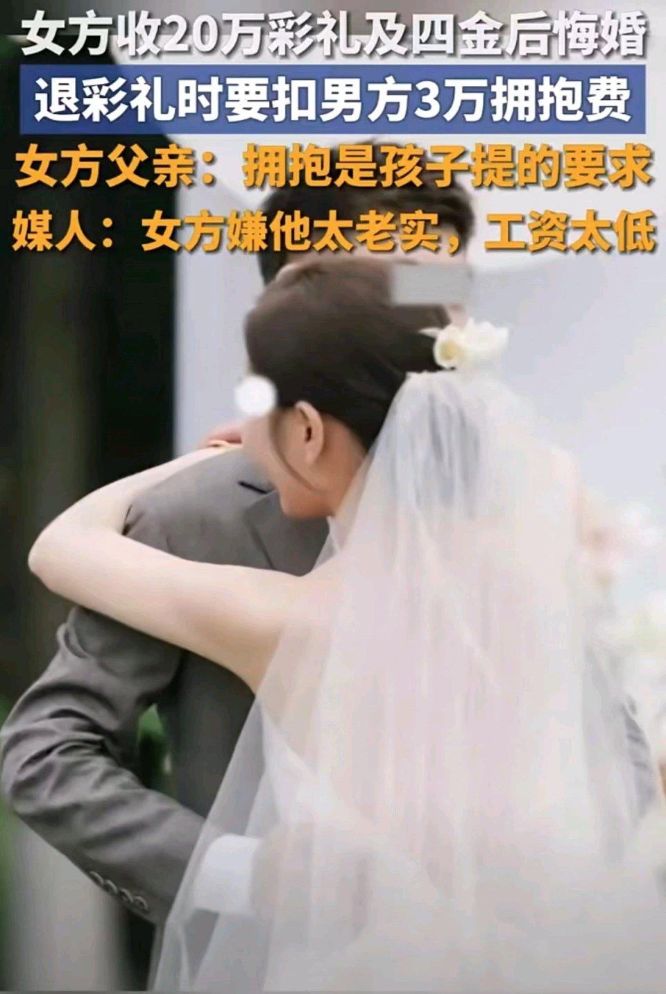 河南平顶山这事儿太奇葩了!男方为结婚前前后后给女方20万左右彩礼和四金,临近婚礼女方突然悔婚。商量退钱时,女方竟要扣3万“拥抱费”,先是说拥抱是男方提的要求,后又解释是恋爱一年多的花费。 这种“拥抱费”毫无法律依据,我国民法典明确禁止借婚姻索取财物。这事儿也暴露了婚恋关系过度物质化的问题,在女方眼中,亲密接触都能量化计价。 不过最终双方协商,女方退还170500元。类似的彩礼纠纷不少,这提醒大家,在婚恋中别让物质冲昏头脑,不然好好的感情容易变味。 女子悔婚退彩礼,该不该扣3万“拥抱费”? | 新京报快评