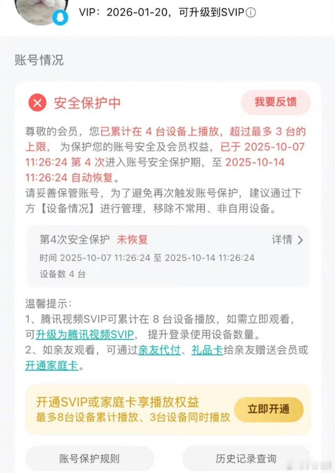 然而现在的视频平台店大欺客,推出什么超前点映,强行植入各种广告,还设置各种条条框框,甚至动辄封号,这有点欺人太甚吧! 腾讯视频回应VIP账号设备超限被封