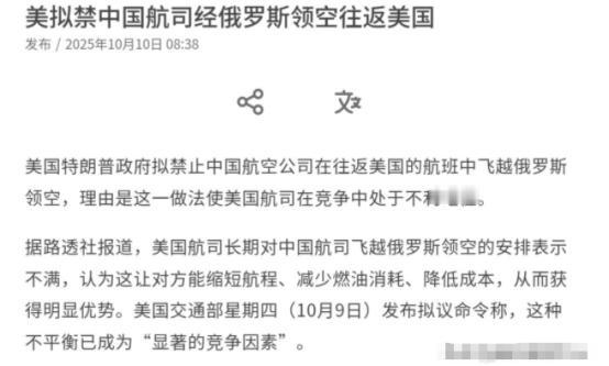 把我们当软柿子,美国又妄图对我们下黑手了!10月10日,根据外媒报道,外媒称,美国特朗普政府拟禁止中国航空公司在往返美国的航班中飞越俄罗斯领空,理由是这一做法使美国航司在竞争中处于不利地位。美国交通部称,禁止中国航司飞越俄罗斯领空旨在弥合中美航空公司之间的竞争差距,并强调当前局面“不公平”,已对美国航司造成重大且不利的竞争影响。 可稍微捋捋前因后果就知道,这事儿从头到尾都是美国自己折腾出来的。之前美国主动对俄罗斯搞制裁,俄罗斯哪儿能吃这亏,直接反制不让美国航班飞越自己的领空。 这下可好,美国航司往返欧亚的航线一下子就绕远了,不仅耗时长,燃油成本、机组成本全跟着往上涨,航班竞争力自然掉了一大截。 正常逻辑下,美国该做的是跟俄罗斯坐下来沟通,想办法解决航线问题。可他们偏不,反倒把矛头对准了中国,觉得咱们好欺负,想拿中国航司开刀来转嫁自己的麻烦。 这不是典型的自己搬起石头砸自己的脚,转头却要让别人付出代价嘛? 要知道,中国航司选择飞越俄罗斯领空,完全是合规合理的商业选择。国际民航组织有明确规定,只要获得相关国家批准,航空公司就有权选择最优航线。 俄罗斯既然同意中国航司使用其领空,咱们按规矩申请、按流程飞行,既没违反任何国际法,也没损害任何第三方利益,怎么到美国这儿就成了“不公平”? 美国自己因为制裁陷入航线困境,不去反思自己的政策问题,反而把怨气撒在正常运营的中国航司身上,这根本就是不讲理的霸权逻辑。 再说说所谓的“竞争差距”,美国航司现在的困境,本质上是美国政府的制裁政策反噬的结果。就拿纽约到上海的航线举例,美国航司因为不能飞俄罗斯领空,得绕着北极圈或者印度洋飞,单程航程比中国航司多了差不多2000公里。 这多出来的距离意味着什么?意味着每趟航班要多烧十几吨燃油,飞行时间要多花3到4个小时,机组人员的工作时长超标,还得额外安排备份机组,单趟航班的成本平白无故增加了几十万美元。 反观中国航司,走俄罗斯领空的航线又短又顺,不仅能把票价定得更有竞争力,还能保证航班准点率,乘客自然更愿意选。 美国不解决自己造成的成本问题,反倒想通过禁止中国航司用最优航线来拉平差距,这跟比赛输了就想拆对方赛道有啥区别? 更有意思的是,美国嘴上喊着“公平竞争”,实际做的全是破坏市场规则的事儿。这些年美国为了保护本土航司,没少搞小动作,比如限制外国航司的航班时刻、提高市场准入门槛,现在又想靠行政命令剥夺中国航司的合理航线选择权。 他们所谓的“公平”,根本就是“只许州官放火,不许百姓点灯”——美国航司能享受各种政策倾斜,中国航司连合规的航线都要被剥夺,这哪儿有半分公平可言? 而且从实际影响来看,这禁令要是真落地,受伤的可不止中国航司。中国每年往返美国的旅客有上百万,其中不少是留学生、商务人士和游客。 中国航司的航班一旦不能飞俄罗斯领空,要么被迫绕远路提高票价,要么就得减少航班频次,最终承担后果的还是普通乘客。 美国口口声声说为了本国航司利益,可这么做不仅会让美国民众出行成本增加,还可能引发中国的反制措施。 要是中国也对等限制美国航司的航线选择,美国航司在华市场的运营只会更难,到时候美国航司怕是哭都来不及。 再往深了说,美国这招其实是把商业问题政治化,想用行政手段干预正常的航空市场秩序。航空运输业是全球化程度最高的行业之一,讲究的是互联互通、互利共赢。 美国为了自己的政治私利,破坏国际航空运输的正常规则,不仅会损害中美两国乘客和航司的利益,还会影响全球航空业的稳定发展。 之前疫情期间,中美航司好不容易才逐步恢复航班频次,现在美国又搞这一出,无疑会给两国航空合作泼冷水,甚至影响中美经贸和人员往来的大环境。 美国要是真为自己的航司着想,就该停止这种转嫁危机的做法,主动跟俄罗斯沟通解决领空问题,而不是拿中国当替罪羊。 中国从来不怕霸权施压,要是美国真敢实施这一禁令,中国肯定会采取对等反制措施,维护本国航司和乘客的合法权益。 到时候美国航司失去的可就不只是几条航线,而是整个中国市场的机会,这可不是美国政府随便给点补贴就能挽回的。