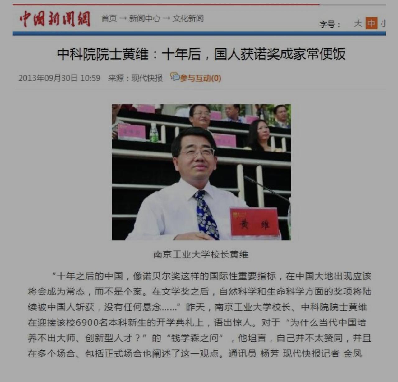 黄维12年前信心百倍的说:“在文学奖之后,自然科学和生命科学方面的奖项将陆续被中国人斩获,没有任何悬念。随着优质学术资源在全球范围分布的变化,中国的几所顶尖大学—基于我们南工梦的早日实现,甚至包括我们南京工业大学,将会进入世界排名前五十、前二十、乃至前十。”