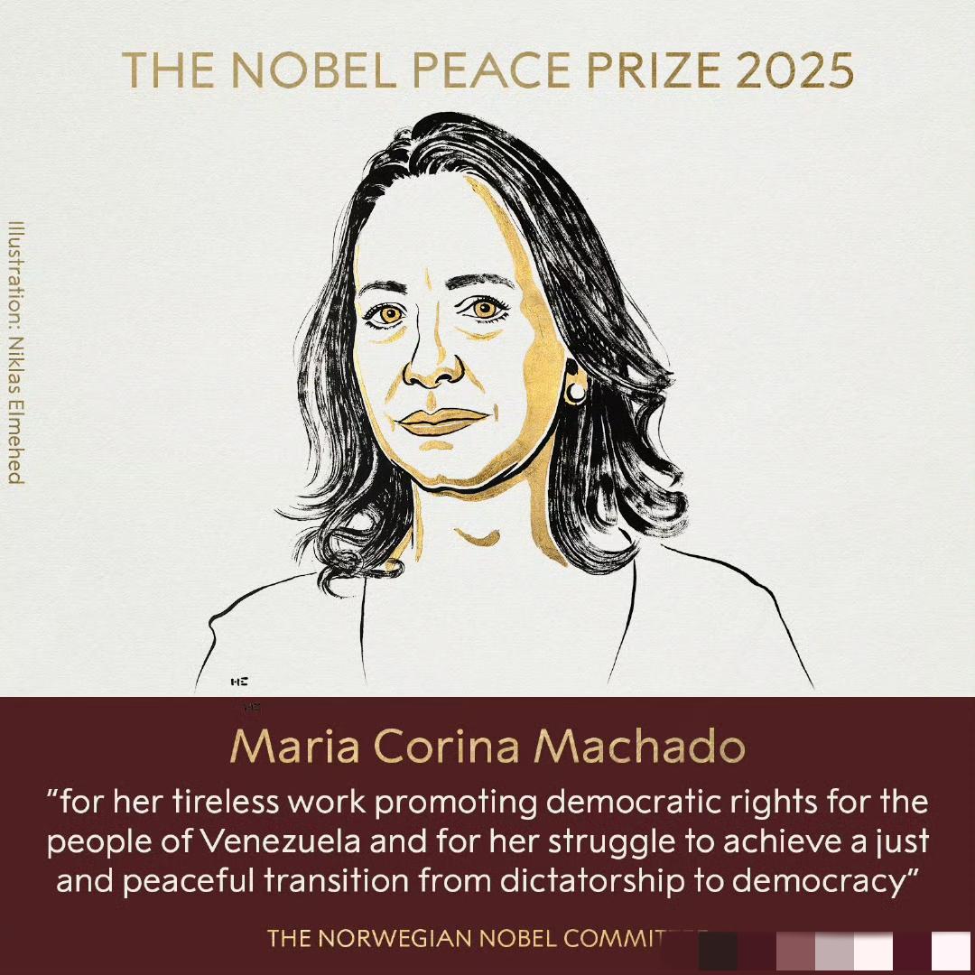 2025年诺贝尔和平奖授予委内瑞拉反对派领导人玛利亚·科里娜·马查多。获奖理由