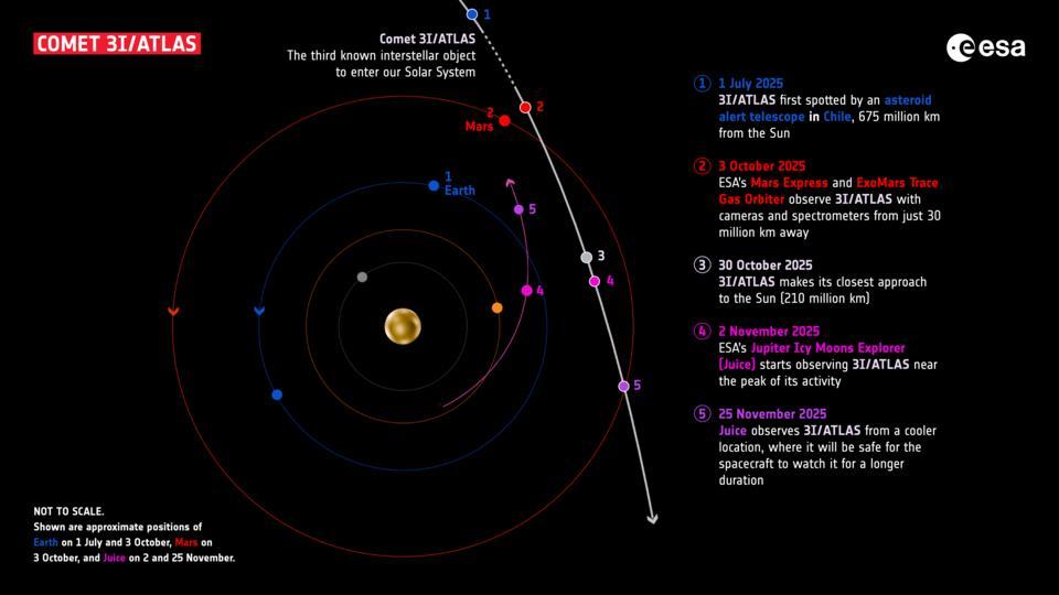 这位星际“闯入者”在10月3日最接近火星时,距离我们的两艘探测器,ExoMars TGO 和 “火星快车”,约有3000万公里。
