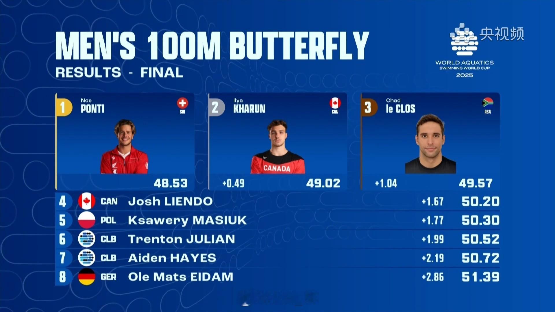 短池游泳世界杯卡梅尔站男100蝶决赛Ponti48.53Kharun49.