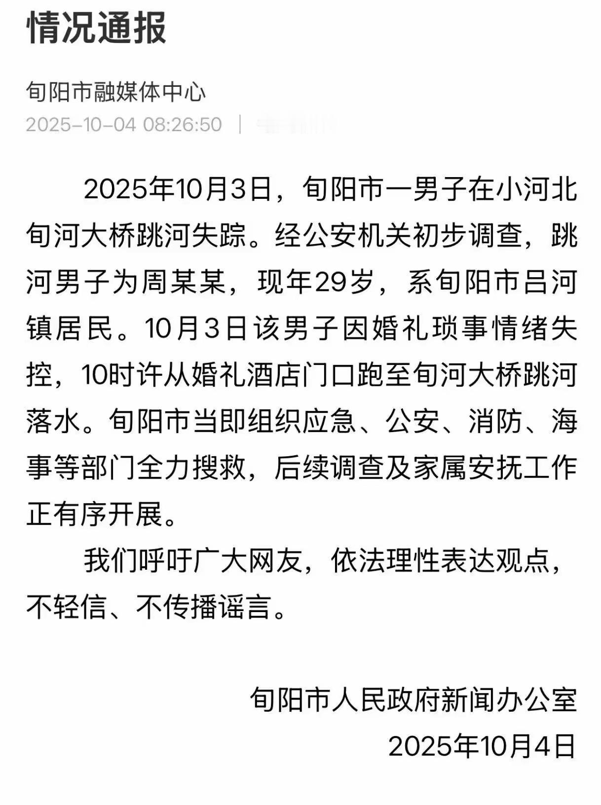 你怎么看2025 年 10 月 3 日陕西旬阳一个新郎跳河自尽? ------------------------------------ 未知全貌,不予置评。
