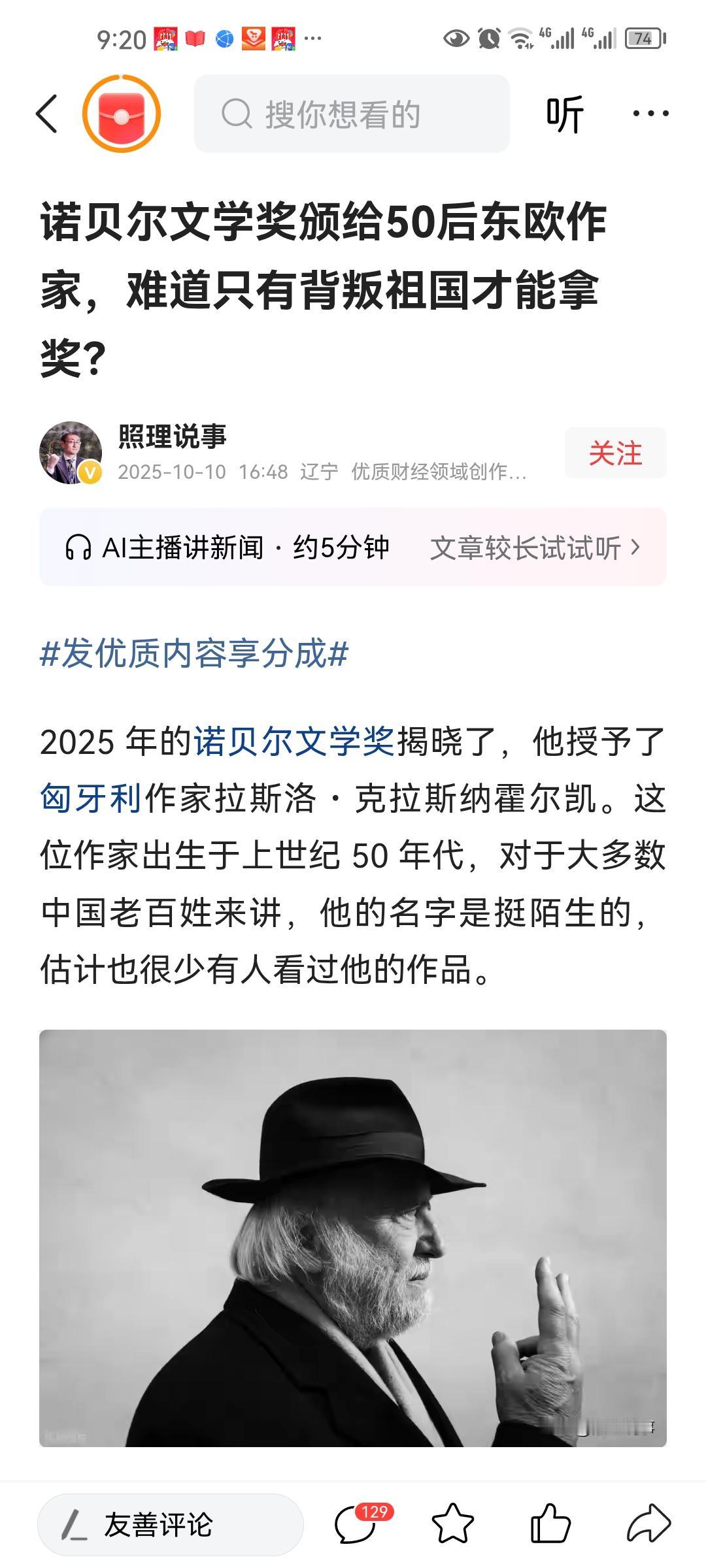 诺贝尔文学奖再遭质疑,拉斯洛被指背叛祖国,莫言又躺枪,鲁讯也要庆幸自己没获诺奖。 匈牙利作家拉斯洛,凭借《撒旦探戈》获得2025年诺贝尔文学奖。就有人质疑——只有背叛祖国才能获奖,正如对莫言的质疑一样。 不由得想起另一位中国文学巨奖,鲁讯。鲁讯未获诺贝尔文学奖,一直让中国读者耿耿于怀。今天看来,未获奖是鲁讯的幸运。 第1,鲁讯广泛批评了G人的精神胜利法——阿Q精神,和麻木不仁市井小民处世态度。 第2,他辛辣的批评了当时的国民政府,是不是出卖了他的祖国?背叛了祖国? 弟3,鲁讯处在日本J国主义一步步蚕食中国领土的时代,却从未骂过日本人。反而同莫言一样赞美日本人,莫言写了《北海道的人》,鲁讯也写了《藤野先生》。 尊敬的网友,你怎么看? 我特别想知道的是,匈牙利人对拉斯洛获奖的态度和待遇是什么?