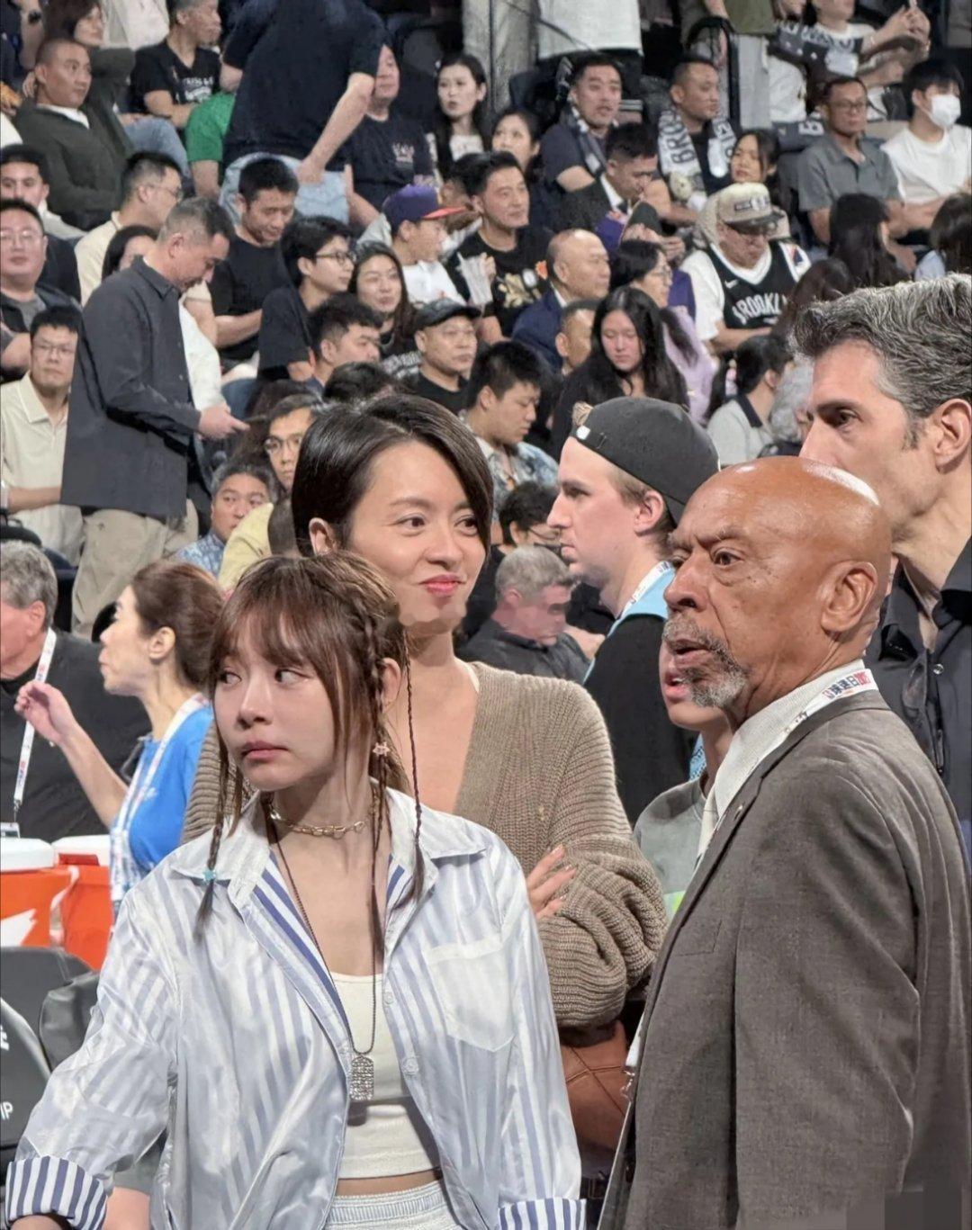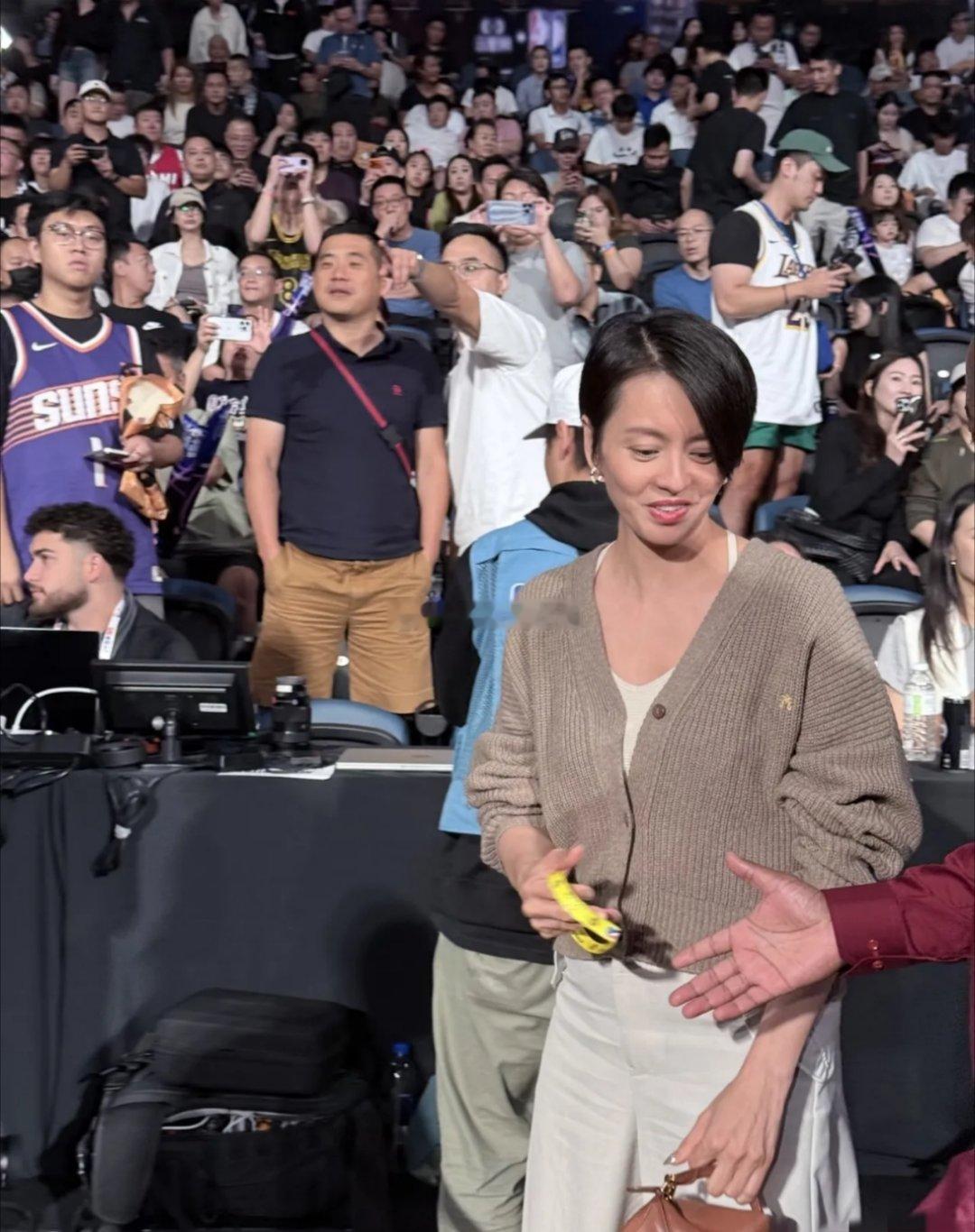 澳门NBA球赛上偶遇梁咏琪,本人又高又瘦很年轻。她身穿着浅灰色针织外套搭配白色裤