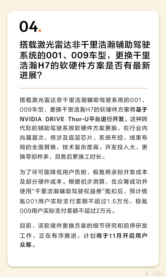根据初步测算,在众筹成功并使用“千里浩瀚辅助驾驶权益券”抵扣后,预计极氪 001 用户实际支付差额不超过 1.5 万元,极氪 009 用户实际支付差额不超过 2 万元。