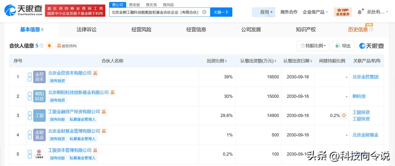 【工银投资等成立科创数聚股权基金 出资额5亿】 天眼查工商信息显示,近日,北京金朝工融科创数聚股权基金合伙企业(有限合伙)成立,执行事务合伙人为工银资本管理有限公司、北京金财基金管理有限公司,出资额5亿人民币,经营范围为私募股权投资基金管理、创业投资基金管理服务。合伙人信息显示,该基金由北京金控资本有限公司、北京朝阳科技创新基金有限公司、工银金融资产投资有限公司、北京金财基金管理有限公司、工银资本管理有限公司共同出资。 天眼查信息:
