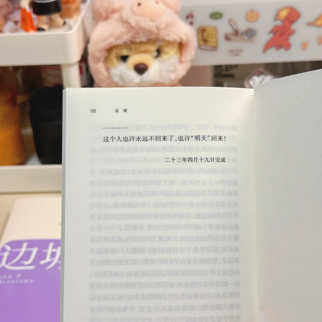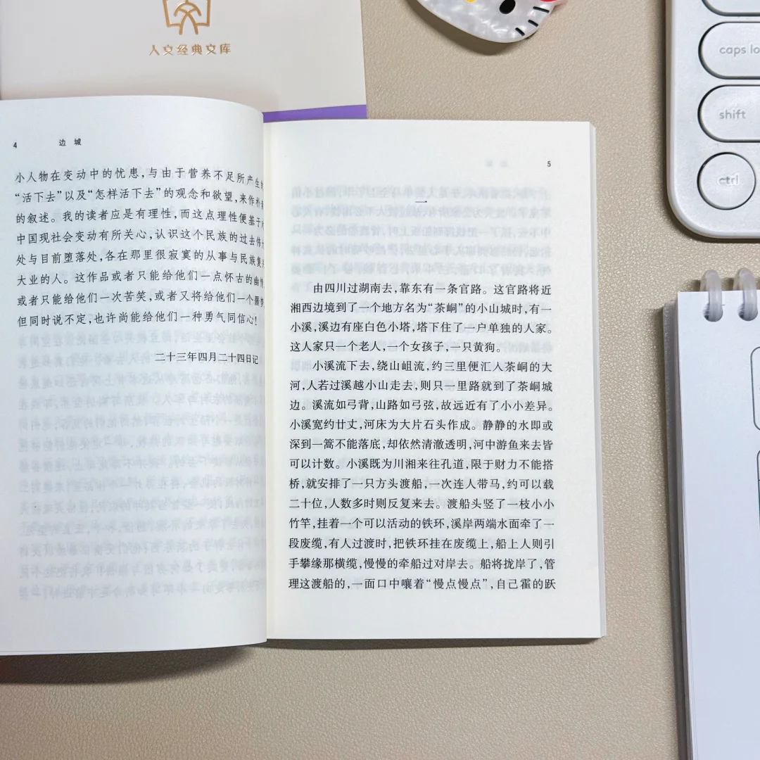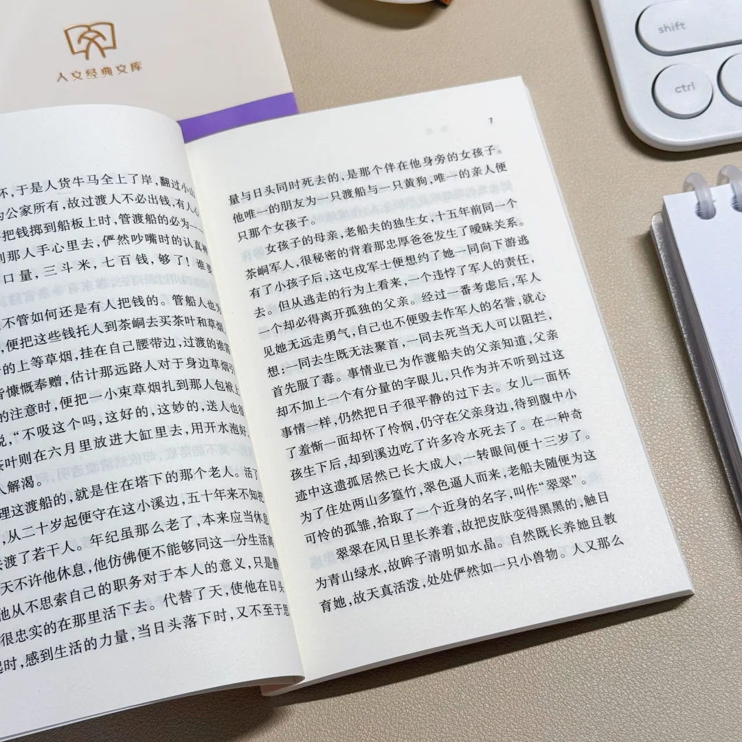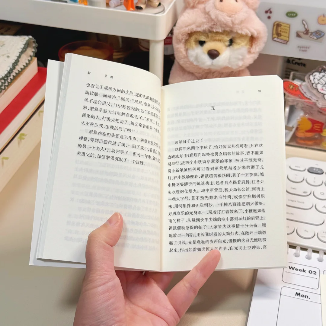薄薄一小本《边城》是我的第一个选择,翠翠的故事我看过多遍,可经典到底是经典,总是想让人再读一遍。再加上沈从文写的极美又流畅,每次看都觉得画面感很强,让我觉得原来文字也能柔柔的像一汪春水。