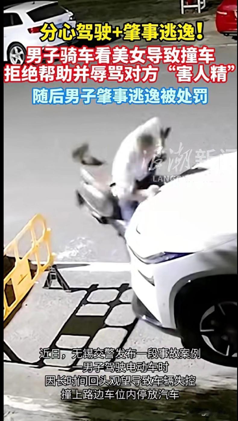 “家人们谁懂啊!无锡一哥们骑电动车时光顾着回头看美女,结果直接失控撞上路边停着的汽车!撞了车不仅不帮忙,还骂对方是‘害人精’,然后撒腿就跑,这操作也是绝了! 咱就是说,骑车看美女虽‘养眼’,但分心驾驶真要命啊!这哥们不仅得为自己的‘花痴’行为买单,肇事逃逸更是错上加错。交警蜀黍最后也没惯着他,必须处罚! 所以啊,不管是开车还是骑车,都得专心致志,别让一时分心酿成大错,更别学这种肇事逃逸还嘴硬的操作,不然可就不是丢面子那么简单了!”