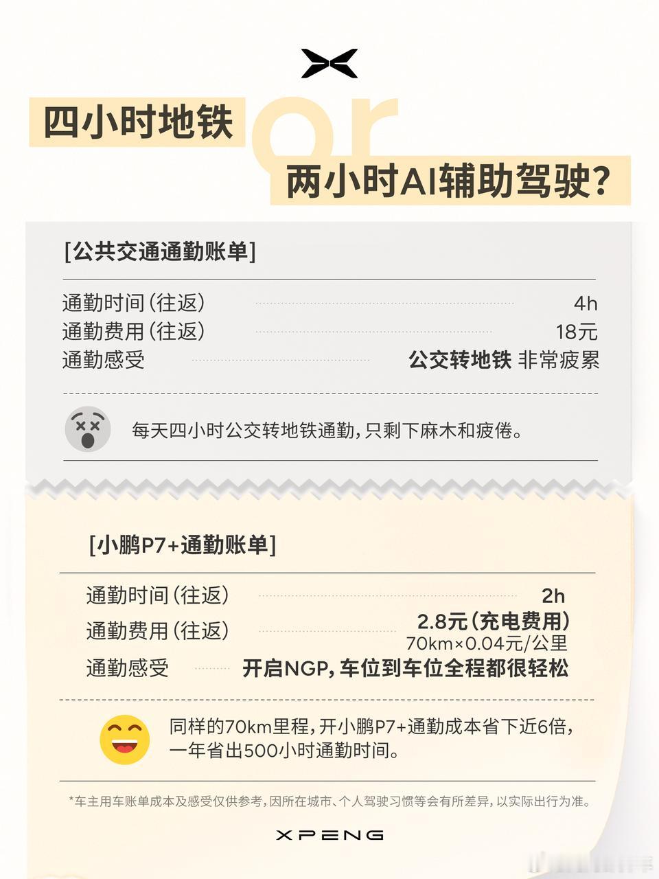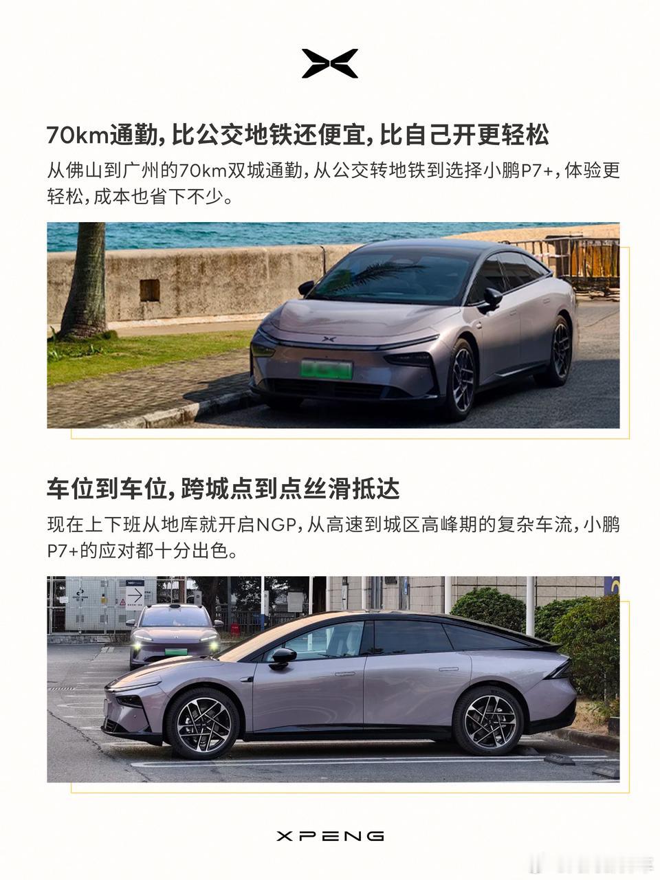 2.比地铁还省!有网友计算过,开小鹏P7+通勤70公里,成本竟比坐公交地铁还低!往返通勤成本从18元/4小时降至电费2.8元/省2小时,实现了舒适度与经济效益的双重跃升,这才是精打细算的优质生活。