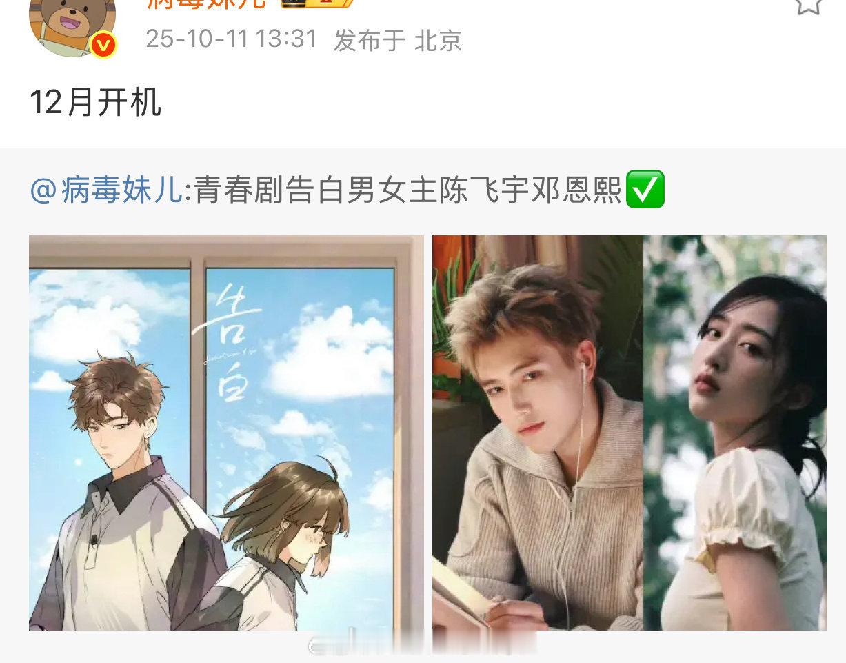 🍉陈飞宇、包上恩《告白》,10月开机,坏男孩vs乖乖女,阿瑟的舒适区​​​