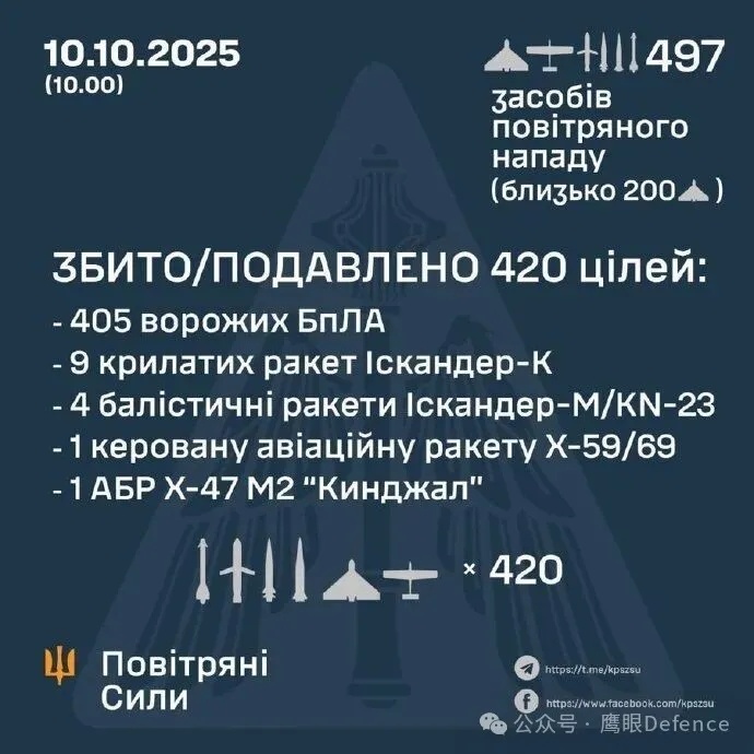 俄军在昨日再次对乌克兰发动了大规模空袭,根据乌克兰空军发布的战报,俄军在本轮空袭中发射了465架无人机和32枚不同型号的对地攻击导弹,乌军击落、干扰了405架无人机、1枚“匕首”空射弹道导弹、4枚“伊斯坎德尔-M”或KN-23弹道导弹、9枚“伊斯坎德尔-K”巡航导弹和1枚KH-59或KH-69空地导弹,60架无人机和17枚导弹突防成功,击中目标。