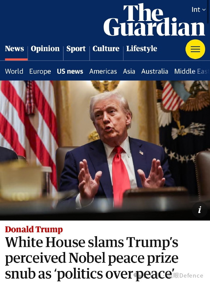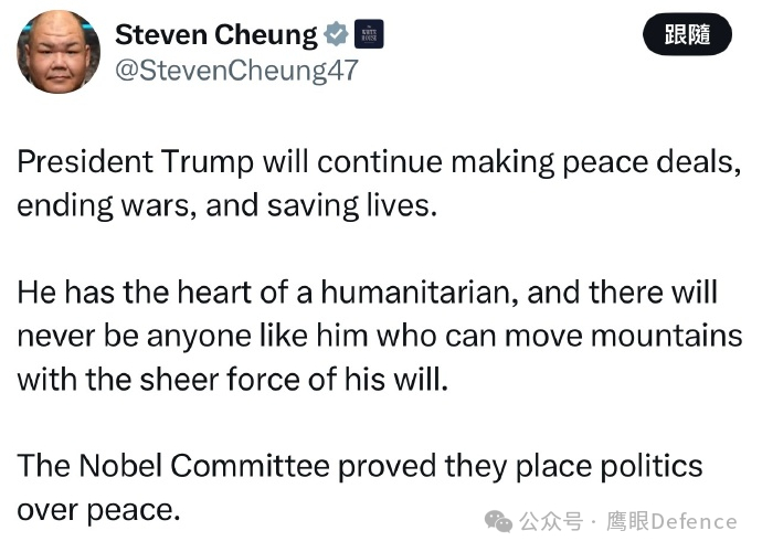 白宫通讯主任斯蒂文·张痛批挪威诺贝尔委员会,指责其将政治置于和平之上,指出特朗普会继续促成和平协议,结束战争并拯救生命,“他拥有人道主义的心,再也没有人像他一样,能凭借意志达成极为艰难的目标。”
