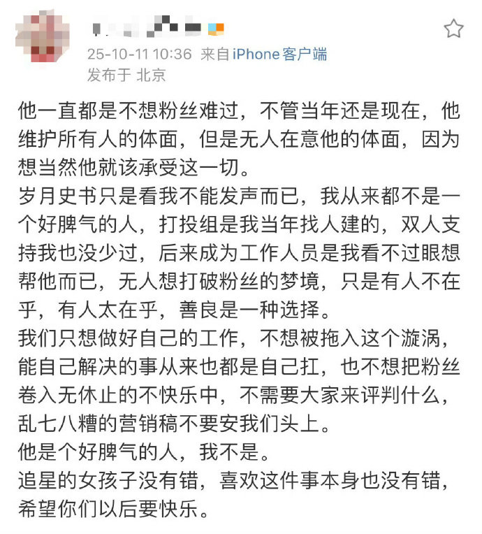 他是个好脾气的人,我不是。追星的女孩子没有错,喜欢这件事本身也没有错,希望你们以后要快乐。”